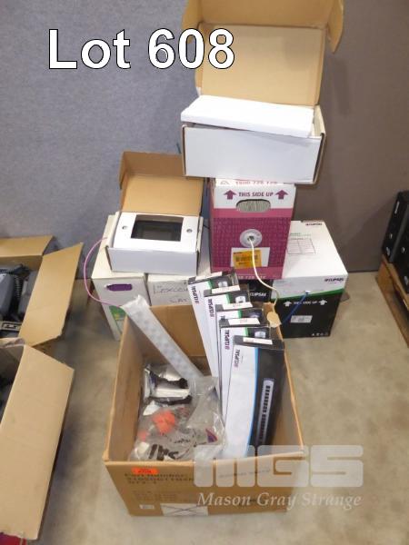 QTY PARTS ROLLS NETWORK CABLES, PHONE CABLE, PATCH PANELS, ENERGY CONTROLLER, 10A 5M EXTENSION CORDS