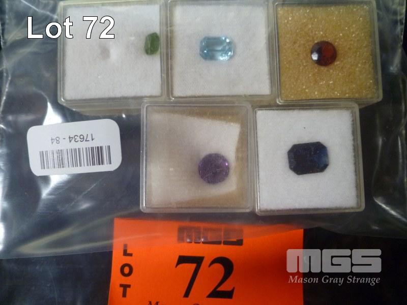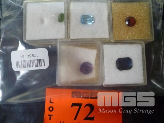 ASSORTED SYNTHETIC CUT STONES, TOPAZ, GARNET, EMERALD, SAPPHIRE, 1.75, 1.36, 1.5, 1.75, 1.46 CARAT