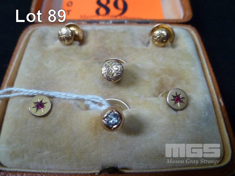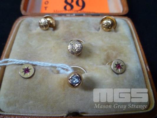6 X GOLD SHIRT STUDS, INC; 3 X 9CT, FLORAL DESIGN, 2 X 9CT, SET WITH RUBY'S, 1 X 15CT SET WITH DIAMOND