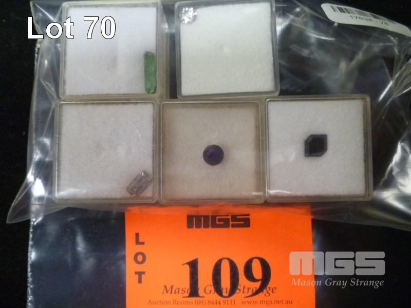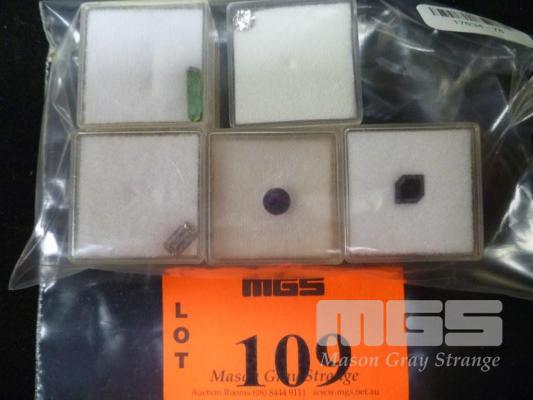 ASSORTED SYNTHETIC CUT STONES, AMETHYST, EMERALD, SPINEL, .65, 1.4, 1.2, .65, 1.15 CARAT