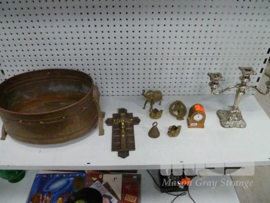 MINIATURE CATHEDRAL STYLE MANTLE CLOCK, MADE IN GERMANY, COPPER BUCKET & ASSORTED BRASSWARE & CANDELABRA