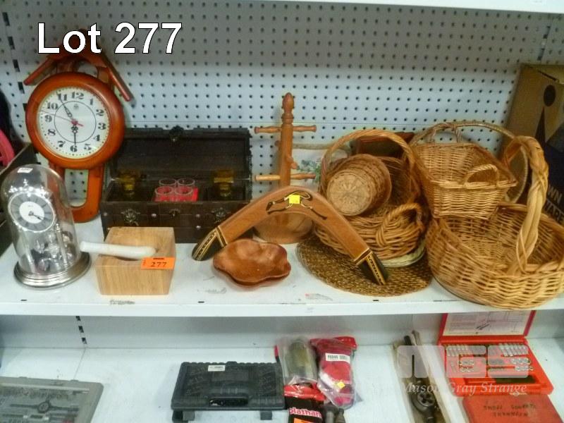 ASSORTED CANE BASKETS, DECANTER SET, CLOCKS ETC