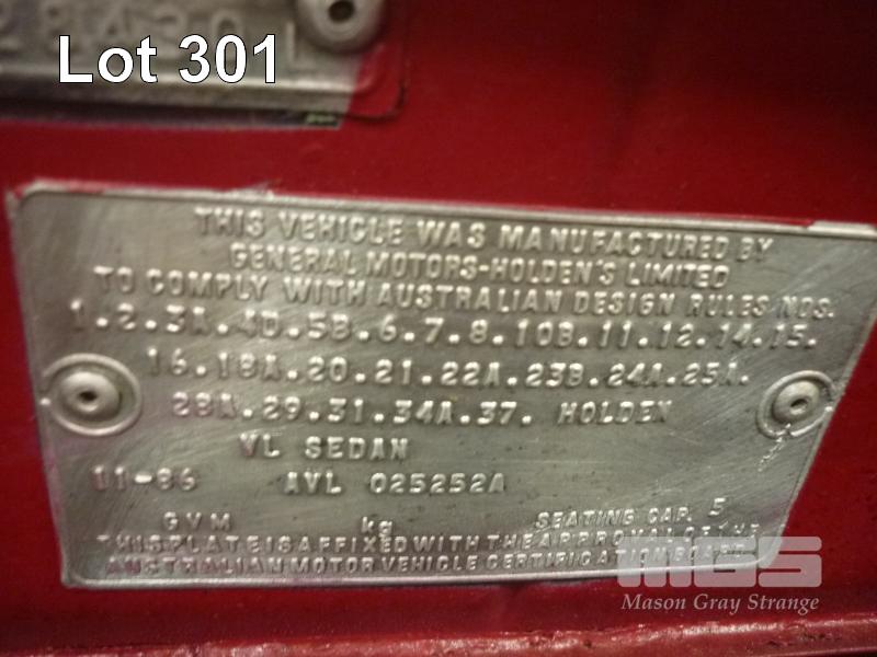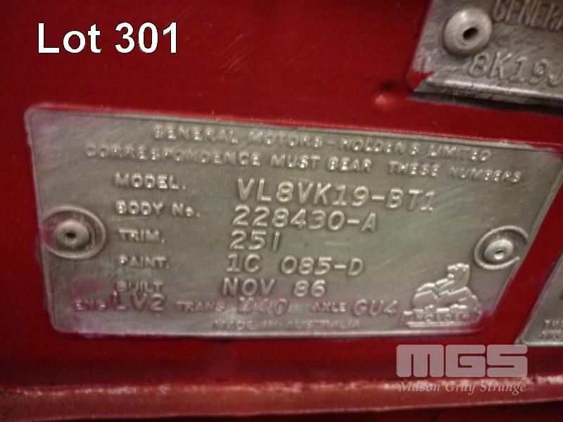 1986 HOLDEN VL COMMODORE BROCK SS GROUP A REPLICA SEDAN REG: NO PLATES (EXPIRED) VIN: 8K19JKL228430 ENG: VJ570392 ODO: 002582 (INDICATED) V8, 5 SPEED MANUAL, PETROL, MAROON DUCO, 4 DOORS, 5 SEAT, RESTORATION REQUIRED, SMASHED WINDSCREEN, ENGINE REQUIRES WORK, EX SAPOL VEHICLE, PETER BROCK SIGNATURE TO GLOVE BOX (AUTHENTICITY UNKNOWN) (NO PAPERS, NO KEYS, NO OWNER'S MANUAL, NO SERVICE BOOKS)
