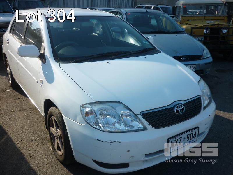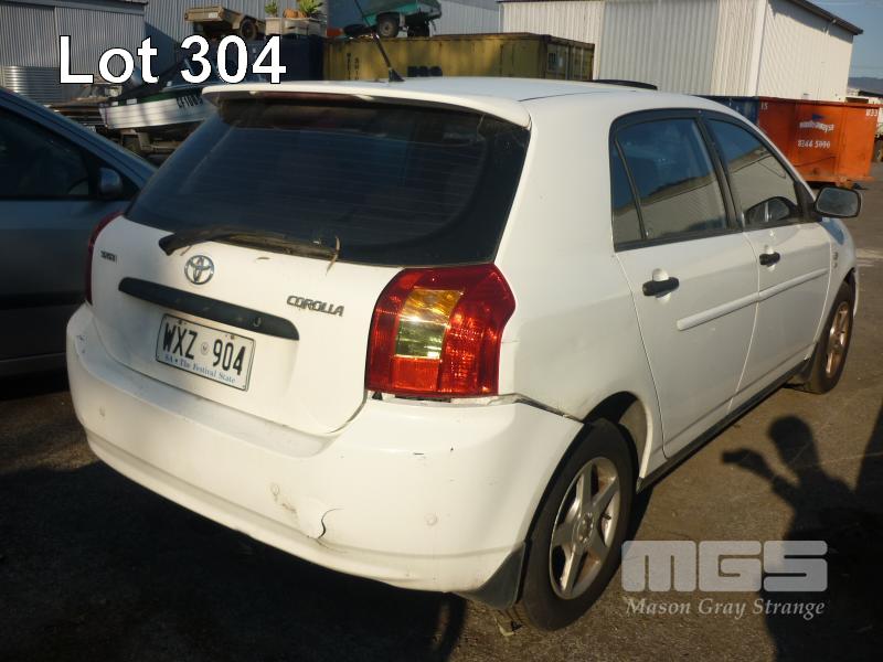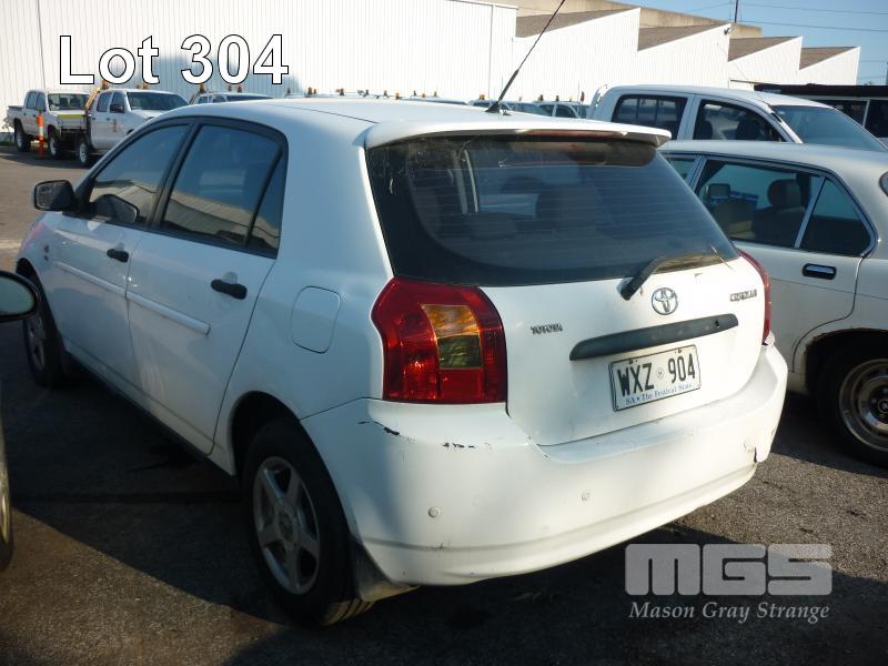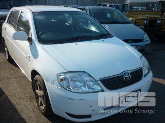 2002 TOYOTA COROLLA SECA HATCHBACK REG: WXZ904 (SA) (EXPIRED) VIN: JTDKR23E802010782 ENG: 1ZZ1243019 ODO: 28,336 1.8 LTR 4 CYLINDER, 5 SPEED MANUAL, PETROL, WHITE DUCO, 4 DOORS, 5 SEAT, AIR BAG, AIR CON, ALLOY WHEELS, CD PLAYER, CENTRAL LOCKING, IMMOBILISER, POWER STEERING, SPARE WHEEL (WITH PAPERS, WITH 1 KEY/S, WITH OWNER'S MANUAL, WITH SERVICE BOOKS) CONDITION: FRONT & REAR BUMPER - DAMAGED FRONT DRIVERS QTR PANEL - DENTED REAR QTR PANELS - DENTED