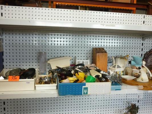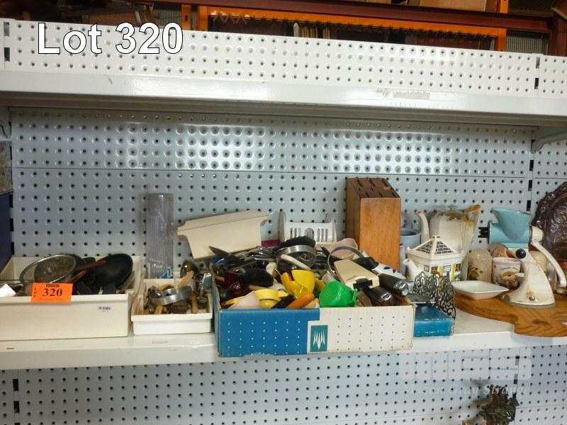 ASSORTED KITCHEN UTENSILS, CUTLERY, TEA POTS ETC