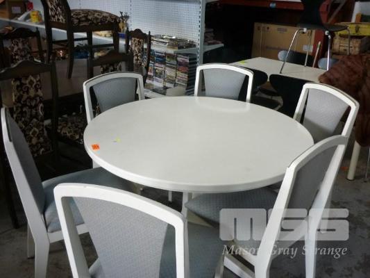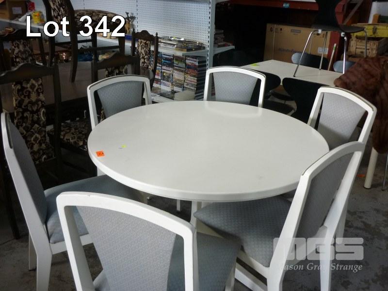 WHITE PAINTED TIMBER 7 PIECE DINING SUITE, ROUND SINGLE PEDESTAL TABLE & 6 x CHAIRS