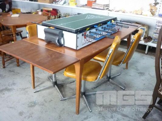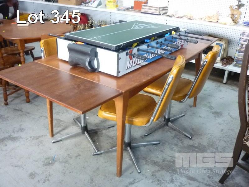 TEAK RECTANGULAR EXTENSION TABLE & 4 X CHROME SWIVEL BASE, VINYL UPHOLSTERED CHAIRS