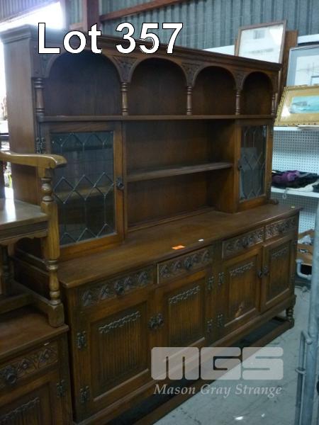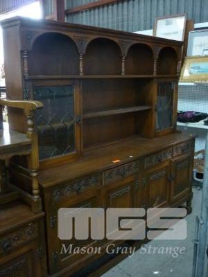 POLISHED TIMBER 2 PIECE WALL UNIT, 4 DOOR/DRAWER, 2 x LEADLIGHT DOORS, CARVED MOTIFS