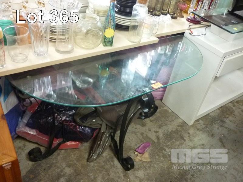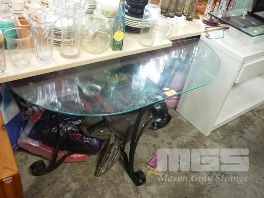WROUGHT IRON, GLASS TOP, HALF ROUND HALL TABLE