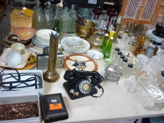ASSORTED GLASSWARE, BOTTLES, BRASSWARE, TABLEWARE, ETC, 1 x TABLE