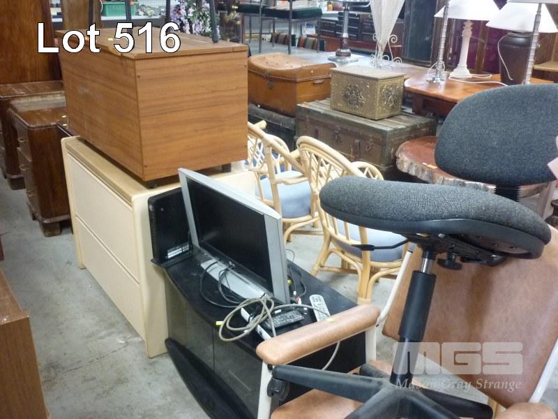 LG 17" LCD TV, SONY DVD PLAYER, TELSTRA MODEM, MOBILE ENTERTAINMENT UNIT, LAMINATE BLANKET BOX, MELAMINE 2 DRAWER FILING CABINET, BEDSIDE CABINET & 2 x CHAIRS