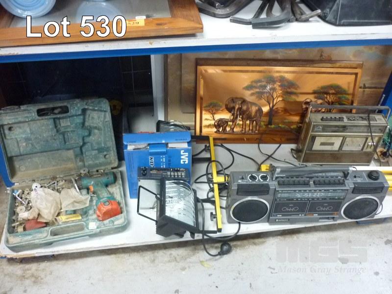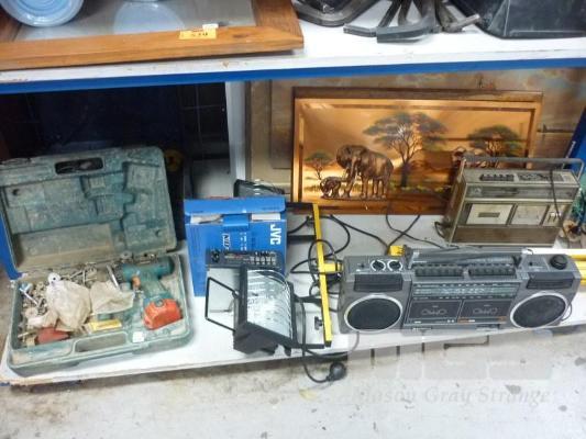 ASSORTED TOOLS, HALOGEN LIGHT STAND, PORTABLE RADIOS, PRINTS ETC