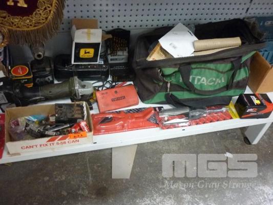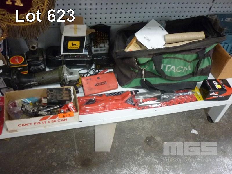 HITACHI CORDLESS DRILL, GRINDER, BATTERIES & CHARGER, ASSORTED TOOLS ETC