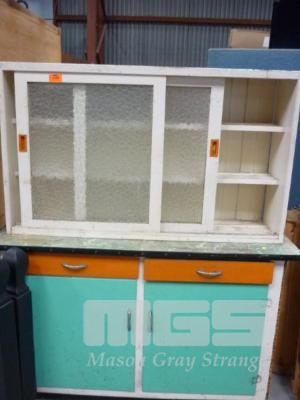 POLISHED TIMBER 2 PIECE KITCHEN CABINET, 2 DOOR/DRAWER UNDERSTORAGE, 2 x SLIDING GLASS DOORS
