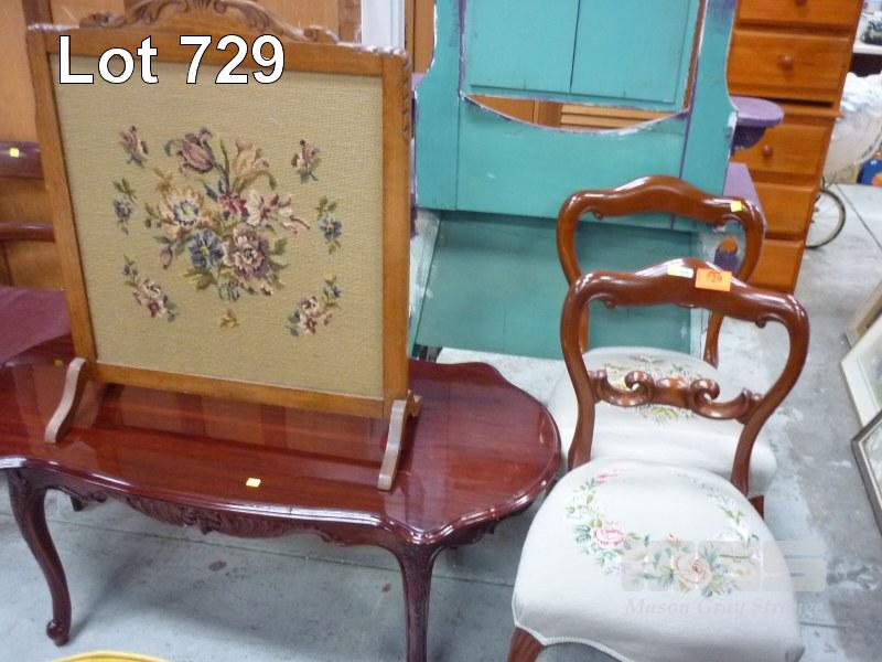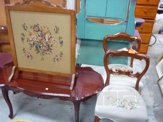 POLISHED TIMBER COFFEE TABLE, PAIR OF POLISHED TIMBER, TAPESTRY FABRIC DINING CHAIRS & TIMBER FRAMED TAPESTRY FIRE SCREEN
