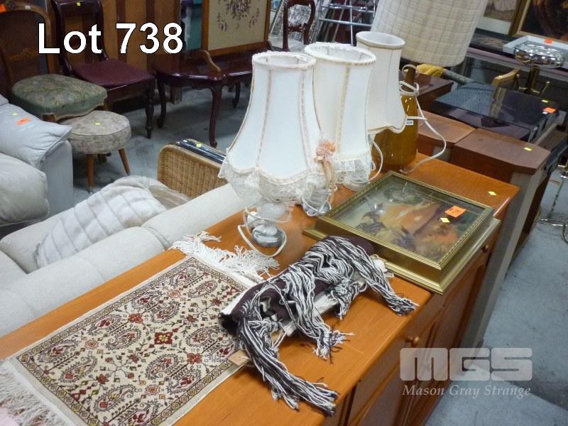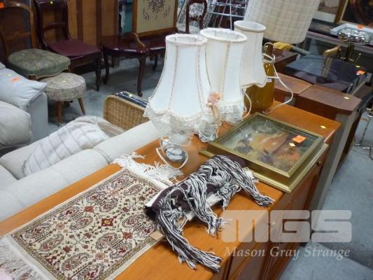 4 x TABLE LAMPS, HOLOGRAPHIC CLOCK & SMALL RUGS