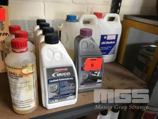 5 x 1 LITRE, 2 x 5 LITRE COOLANTS, ASSORTED & OIL, 2 STROKE & CAN