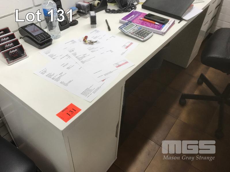 WHITE DESK & CUPBOARD, 200 x 80cm APPROX, EXECUTIVE OFFICE CHAIR, BLACK VINYL, GREY TIMBER LAMINATE 4 DRAWER MOBILE