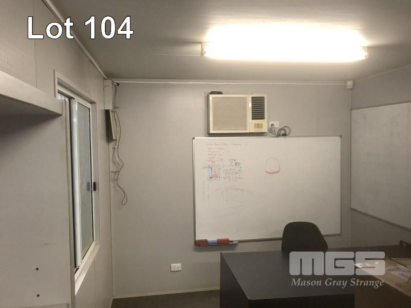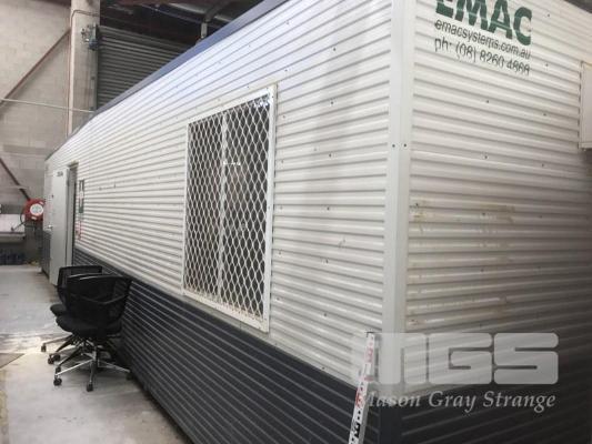 TRANSPORTABLE OFFICE, EMAC, 12x3 MTR. 2 x ROOMS, 1 x ENTRY DOOR, 4 x WINDOWS, 2 x WALL A/C'S S/NO: 2399X08 PLANT NO: 310044 6 x DESKS, 4 x CHAIRS, 1 x BOOKCASE, (ELECTRICIAN TO DISCONNECT)