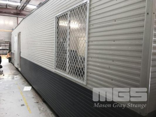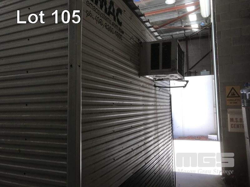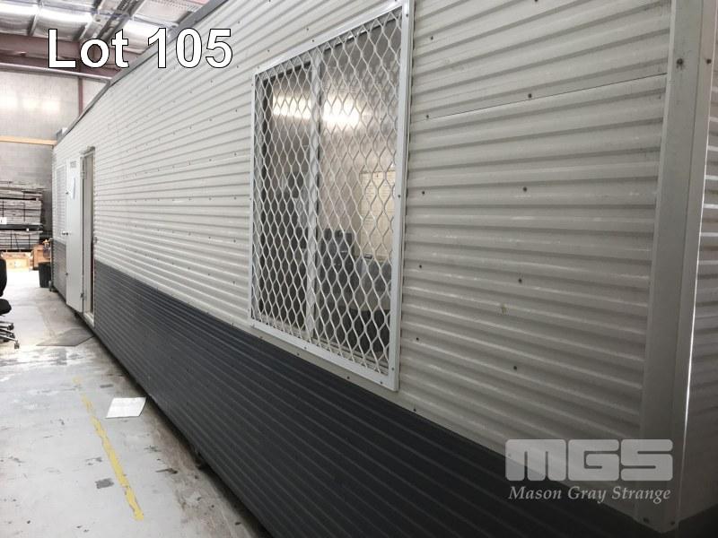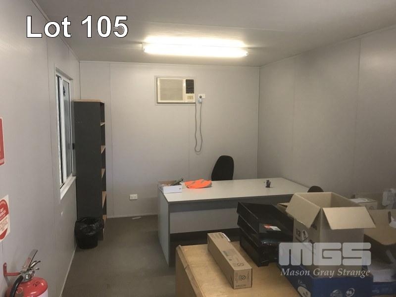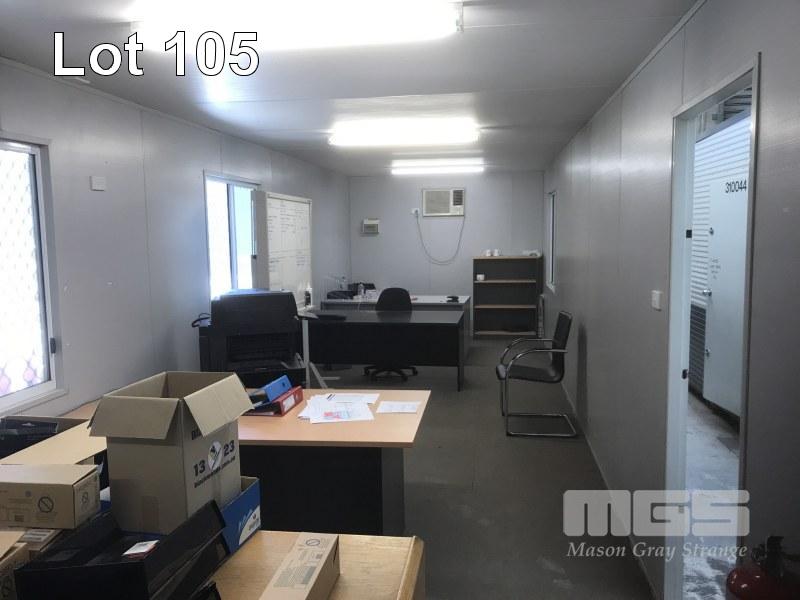 TRANSPORTABLE OFFICE, EMAC, 12x3MTR. 2 x WALL A/C'S S/NO: 2402X08 PLANT NO: 310053 5 x DESKS, 3 x OFFICE CHAIRS, PANABOARD PANASONIC WHITEBOARD (ALL FAULTS) 1 x GREY DRAWER UNIT, BOOKSHELF, 120 x 120cm, 3 TIER PHOTO COPIER NOT INCLUDED.