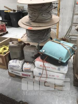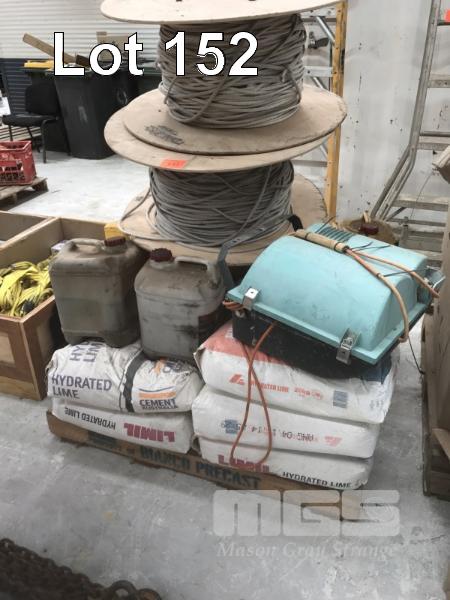 14 x BAGS HYDRATED LIME, 20kg, USED FLOODLIGHTS, 5 x SIKA CURE CRETE, 10 LITRE, NITRO BOND, AQUA GEL & 2 x ROLLS NYLON WINCH ROPE