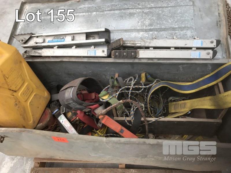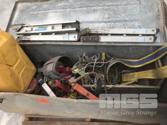 GALV TOOL BOX & CONTENTS, 5T CHAIN BLOCK, 4 x LEVELOK LADDER STABILIZERS, SAFETY HARNESSES