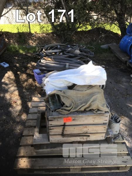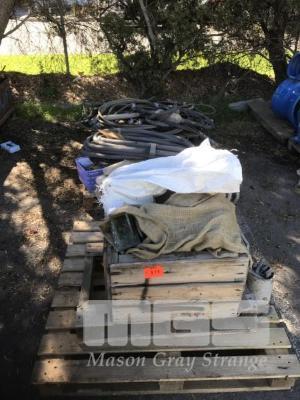 ASSORTED HARDWARE, WIRE ROPES, HOSE, VARIOUS BRACKETS, 3 x PALLETS