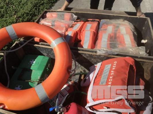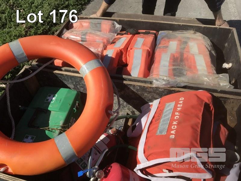 2 x CRATES & CONTENTS FIRST AID KIT, LIFE BUOY, 15 (APPROX) x LIFE JACKETS & 2 x FIRE EXTINGUISHERS