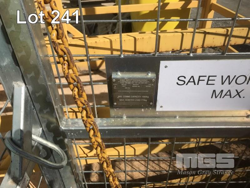 SAFETY CRANE CAGE, EAST WEST ENGINEERING MOD: WD-MC DOM: 2017 S/NO: 107536 WWL: 500kg WEIGHT: 270kg MAX LOAD: 770kg 4 PERSON WITH CHAIN SET