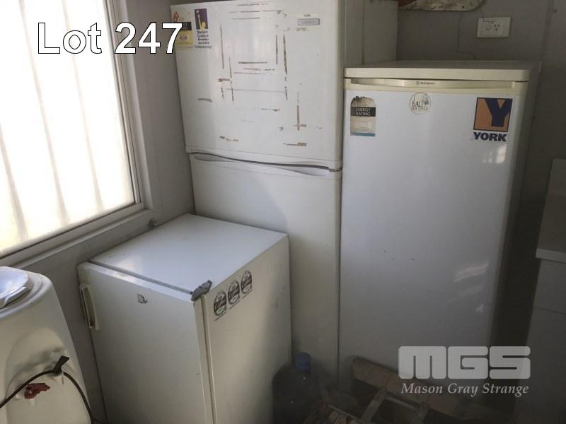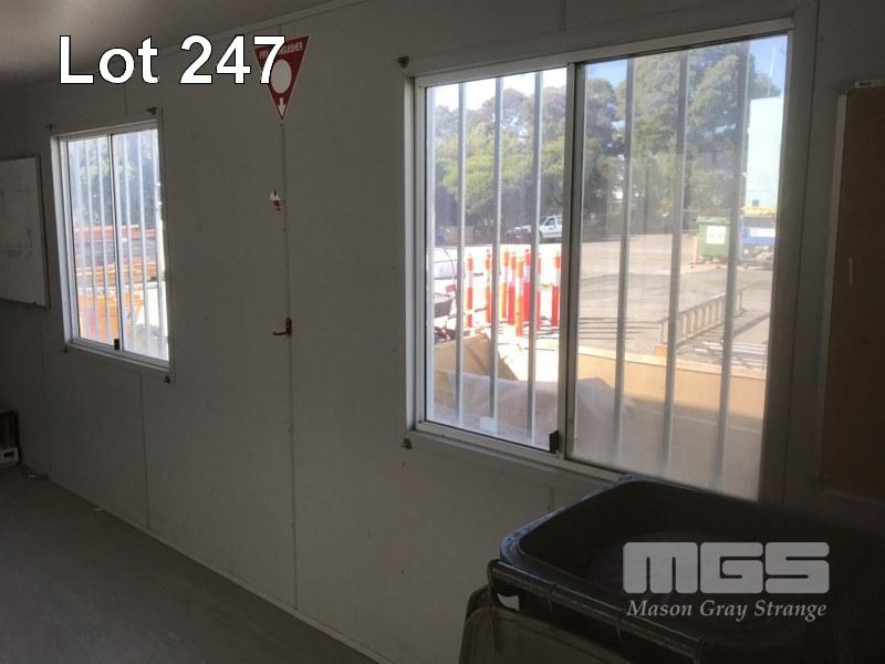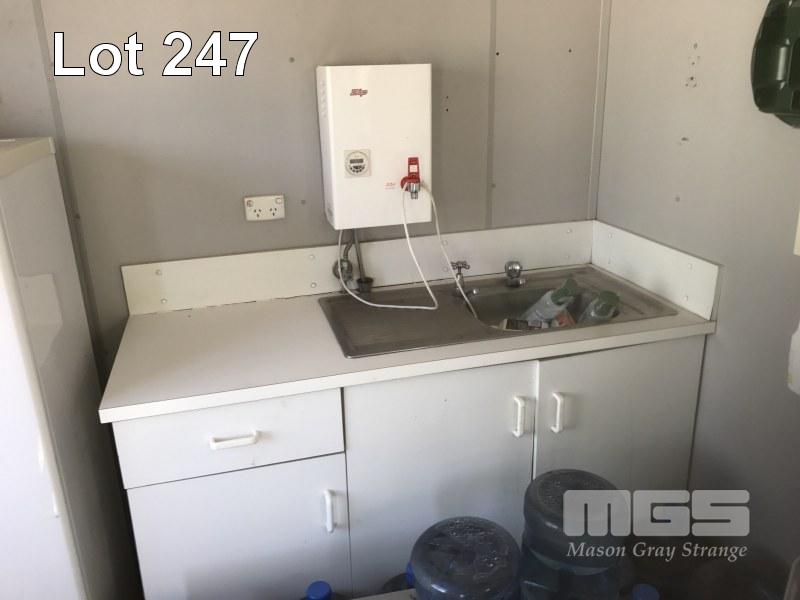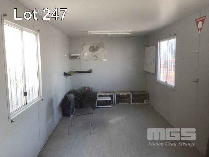 TRANSPORTABLE LUNCH ROOM, APB 12 x 3m, 4 x WINDOWS, 1 x DOOR 7 x TABLES, 44 x CHAIRS, MICROWAVE, SINK, ZIP HOT WATER, 3 x FRIDGES, RUBBISH BINM PIE WARMER & 2 x WALL MOUNT A/C'S AS/NO 310105