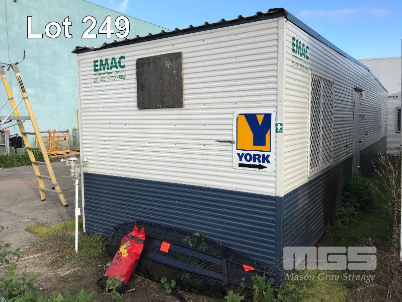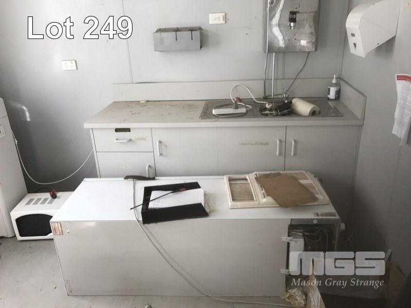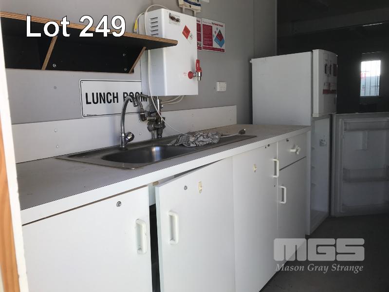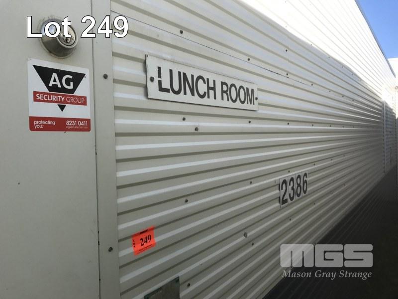 TRANSPORTABLE BUILDING, EMAC LUNCH ROOM 12 x 3m, 4 x WINDOWS, 1 x DOOR 2 x OFFICE CHAIRS, 14 x PVC CHAIRS, WATER COOLER, FRIDGE & 6 x TABLES SINK & BIRKO HWS, STATIONERY CUPBOARD S/NO: 2394X08 PLANT NO: 310048