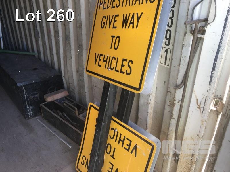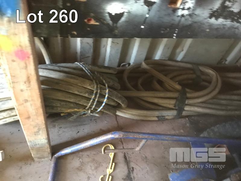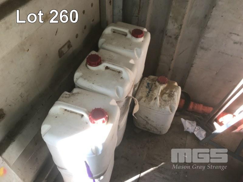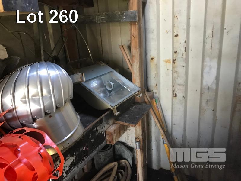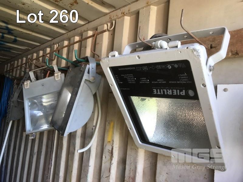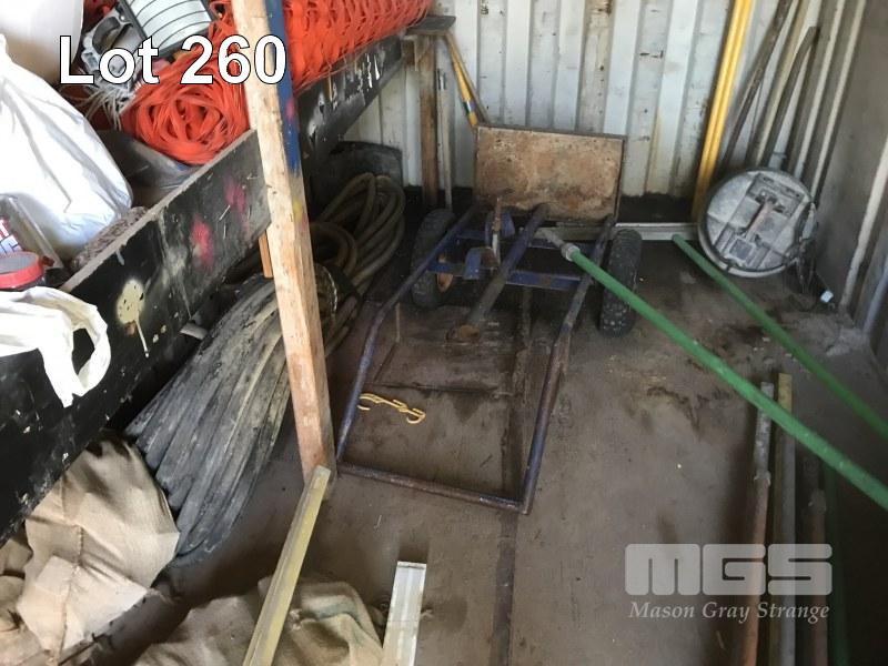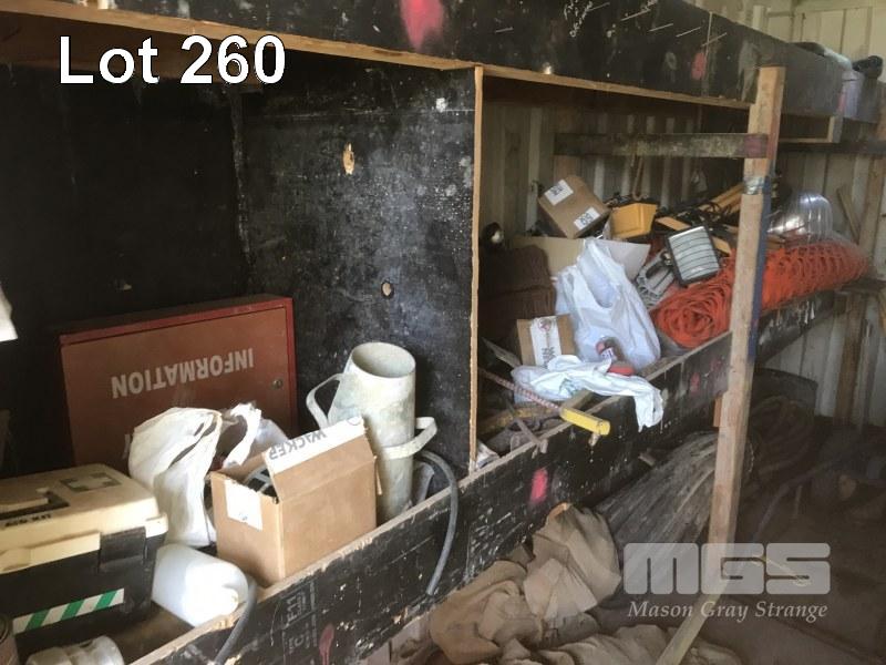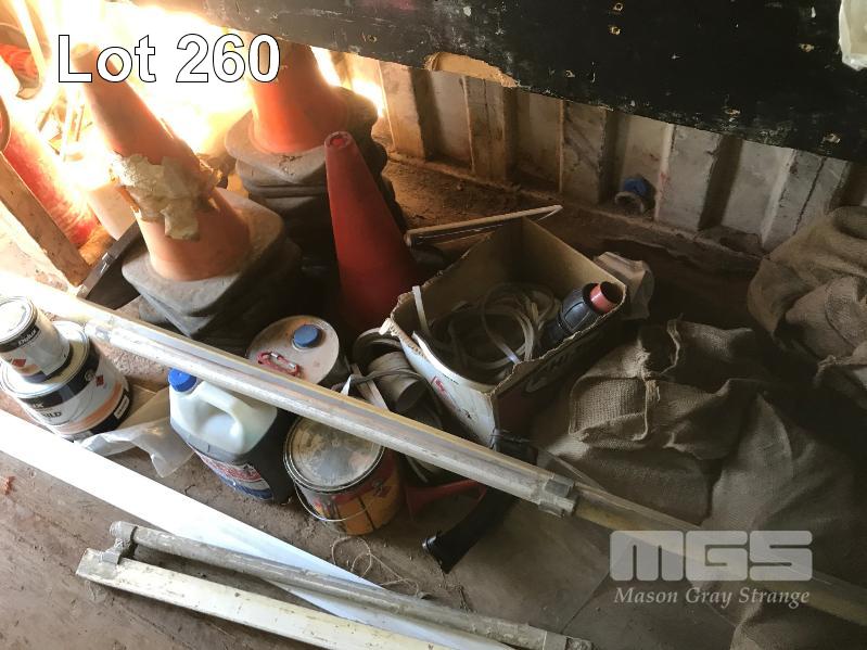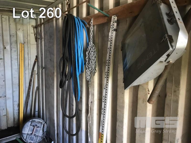 5 x PIERLITE YARD LIGHTS, TOOL BOX & CONTENTS, OXY/ACC TROLLEY, PORTABLE FLOODLIGHTS, WHITE & BLACK HOSES, GREASE GUNS, SAFETY CONES, CONCRETE SCREEDS, HYDRAULIC JACK, AIR HOSE, TARPS & SIGNAGNE (CONTENTS OF CONTAINER)