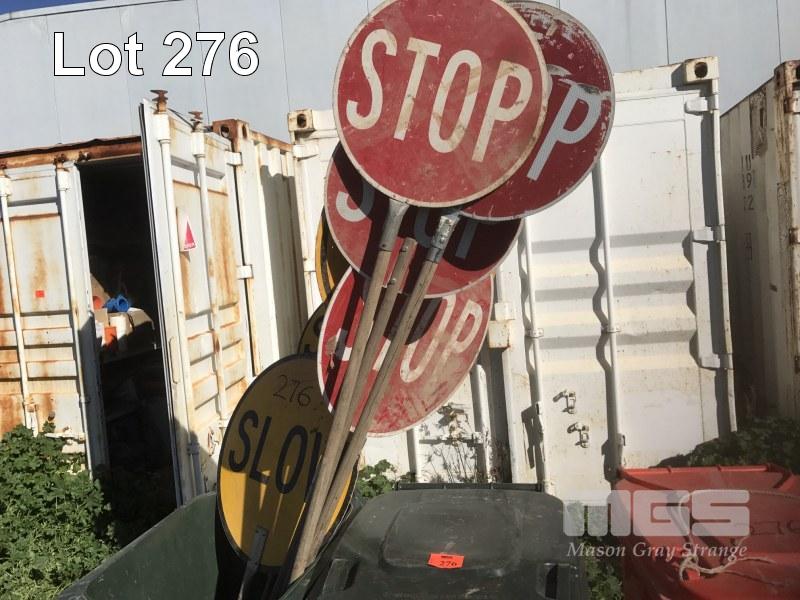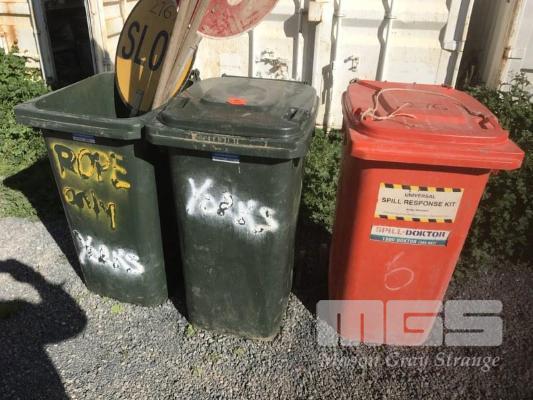 3 x 240 LITRE WHEELIE BINS & CONTENTS, SAFETY (LOLLY POP) SIGNS, ROPES & PLAN HANGERS