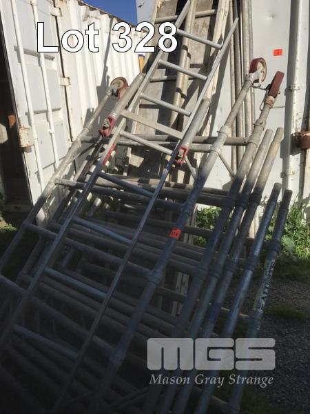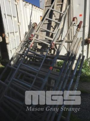 ALLOY SCAFFOLDING COMPONENTS, BASE SECTION, CENTRE SECTION, RAILS, 2 x PLATFORMS, 12 x BRACES & OUT RIGGER