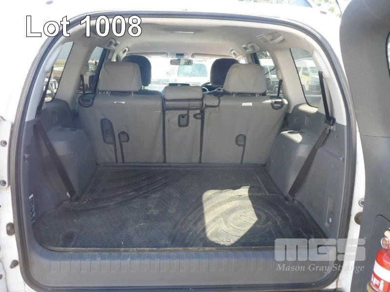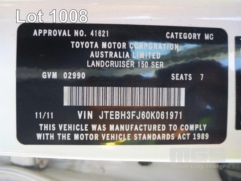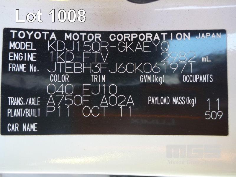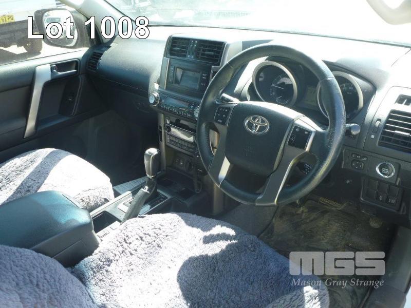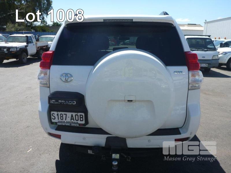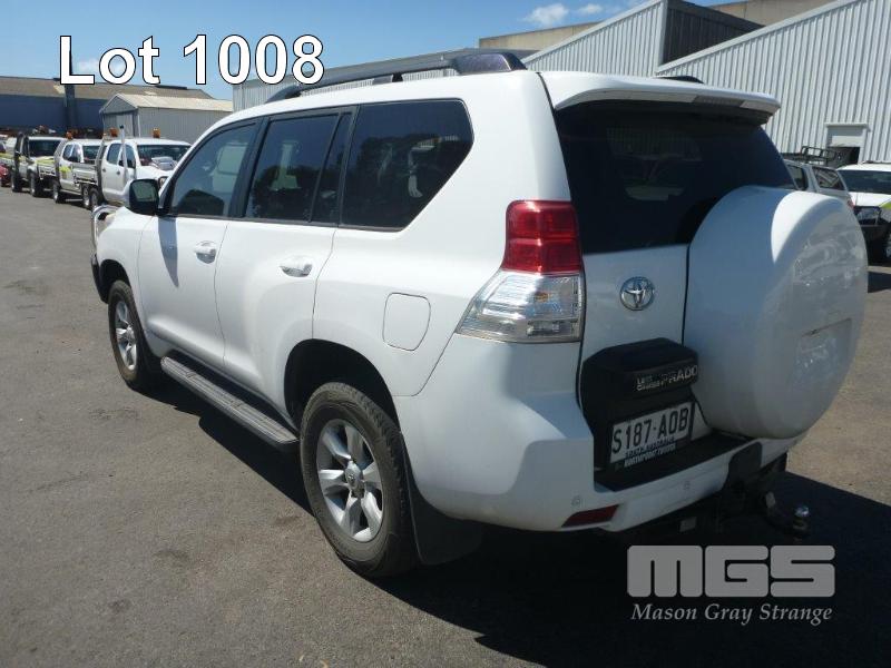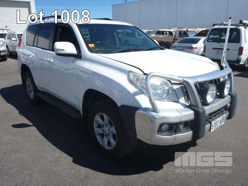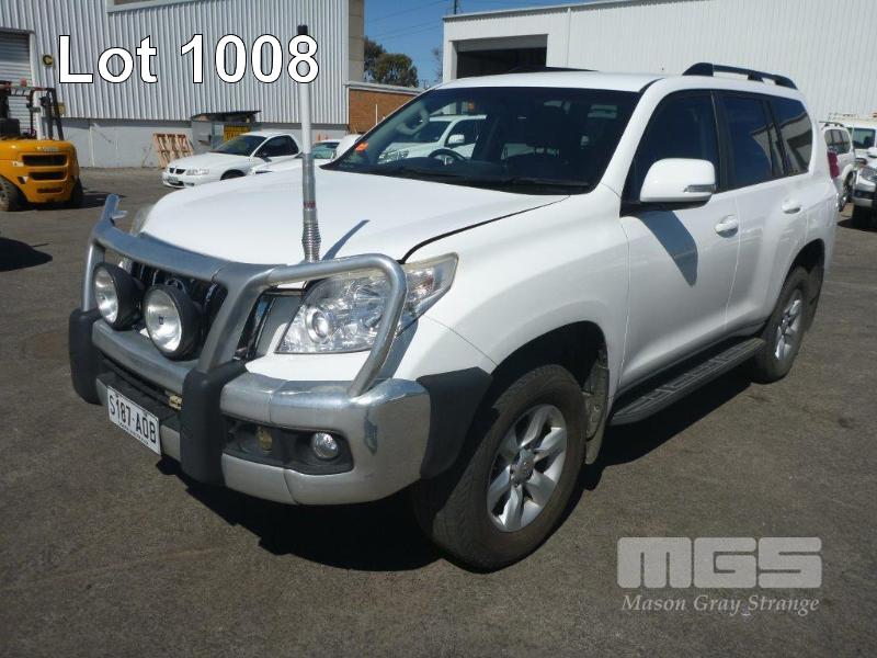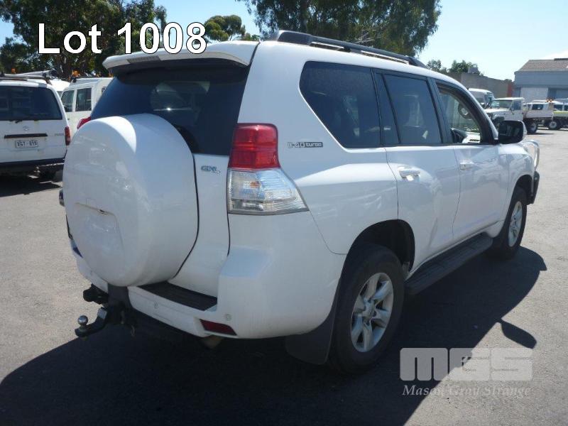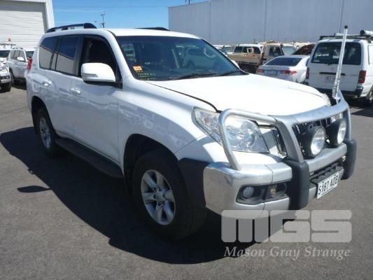 2011 TOYOTA LAND CRUISER PRADO GXL 150 STATION WAGON 4x4 REG: S187 AOB VIN: JTEBH3FJ60K061971 ENG: 1KD2122934 ODO: 124,189kms SHOWING 3 LITRE 4 CYLINDER, 6 SPEED AUTOMATIC TRANSMISSION, TURBO DIESEL, WHITE DUCO, 4 DOORS, 7 SEAT, 4x4 AIR BAG, AIR CON, BLUETOOTH, BULL BAR, CD PLAYER, CENTRAL LOCKING, CRUISE CONTROL, POWER STEERING, POWER WINDOWS, SIDE STEP, SPARE WHEEL, SPOT LIGHTS, TOW BAR, TRACTION CONTROL, ISOLATOR, ANDERSON PLUG, REVERSE CAMERA, CB KEY #Y92 (WITH PAPERS, WITH 1 KEY/S, WITH OWNER'S MANUAL, WITH SERVICE BOOKS)