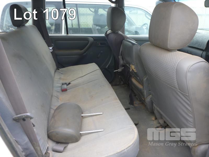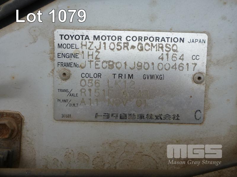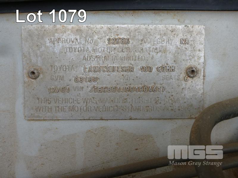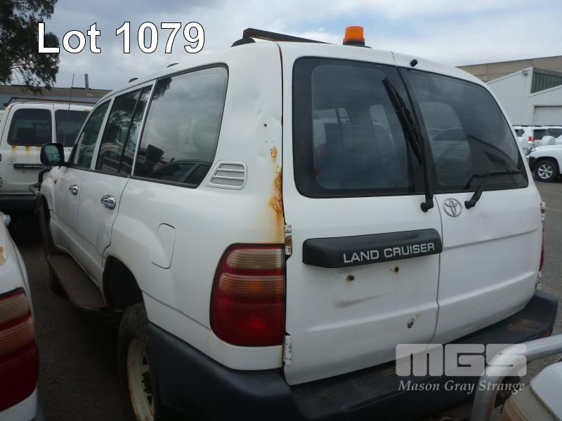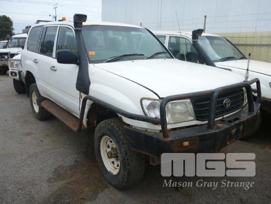 2001 TOYOTA LAND CRUISER HZJ 100 STATION WAGON 4x4 REG: N/A VIN: JTEGB01J901004617 6 CYLINDER, 5 SPEED MANUAL TRANSMISSION, DIESEL, WHITE DUCO, 4 DOORS, 6 SEAT, 4x4 AIR CON, BULL BAR, SIDE STEP, TOW BAR, WARNING LIGHTS, SNORKEL, ISOLATOR SUIT RESTORATION/PARTS (NO PAPERS, WITH 1 KEY/S, NO OWNER'S MANUAL, NO SERVICE BOOKS) CONDITION: OVERALL - RUST EVIDENT, TORN UPHOLSTERY