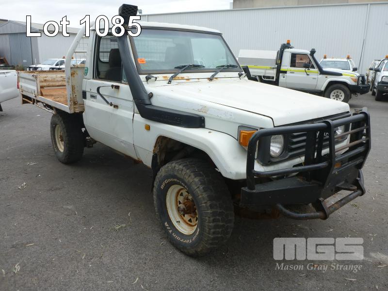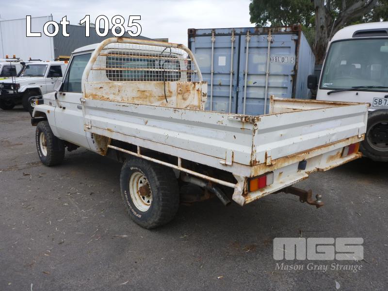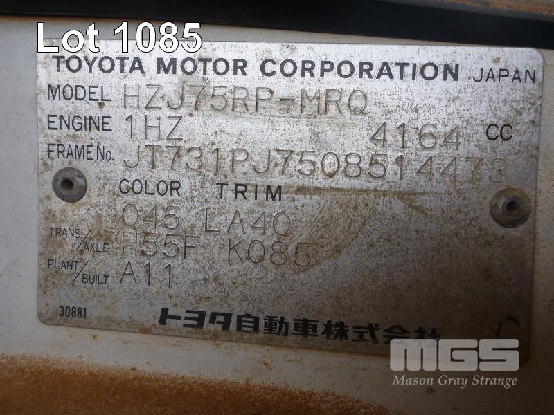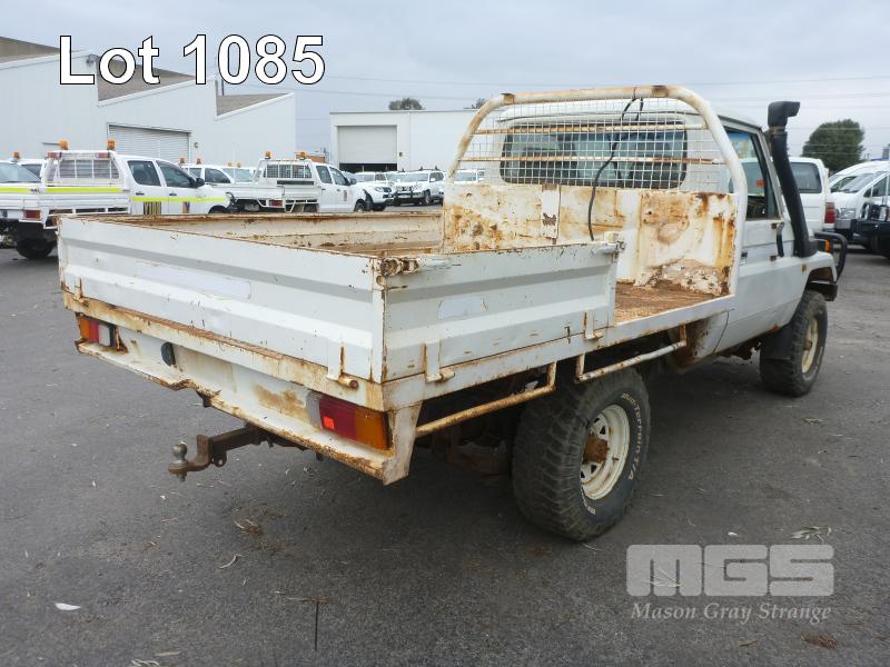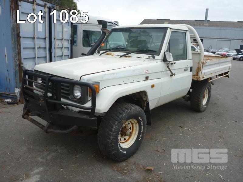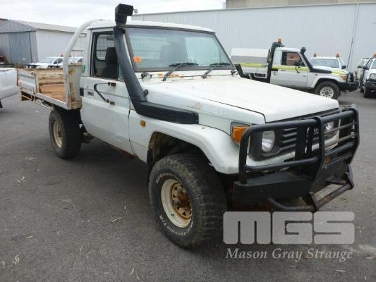 11/92 (CP) TOYOTA LAND CRUISER HZJ 75 TRAY UTILITY 4x4 REG: N/A VIN: JT731PJ7508514473 ODO: 501,250kms SHOWING 4 LITRE 6 CYLINDER, 5 SPEED MANUAL TRANSMISSION, DIESEL, WHITE DUCO, 2 DOORS, 3 SEAT, 4x4 BULL BAR, POWER STEERING, STEEL TRAY, TOW BAR, SNORKEL, ISOLATOR SUIT RESTORATION/PARTS KEY #RAD22 (NO PAPERS, WITH 1 KEY/S, NO OWNER'S MANUAL, NO SERVICE BOOKS) CONDITION: OVERALL - RUST EVIDENT, ROOF LINING GONE