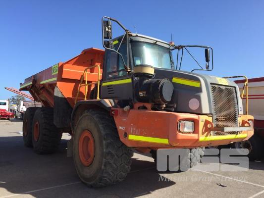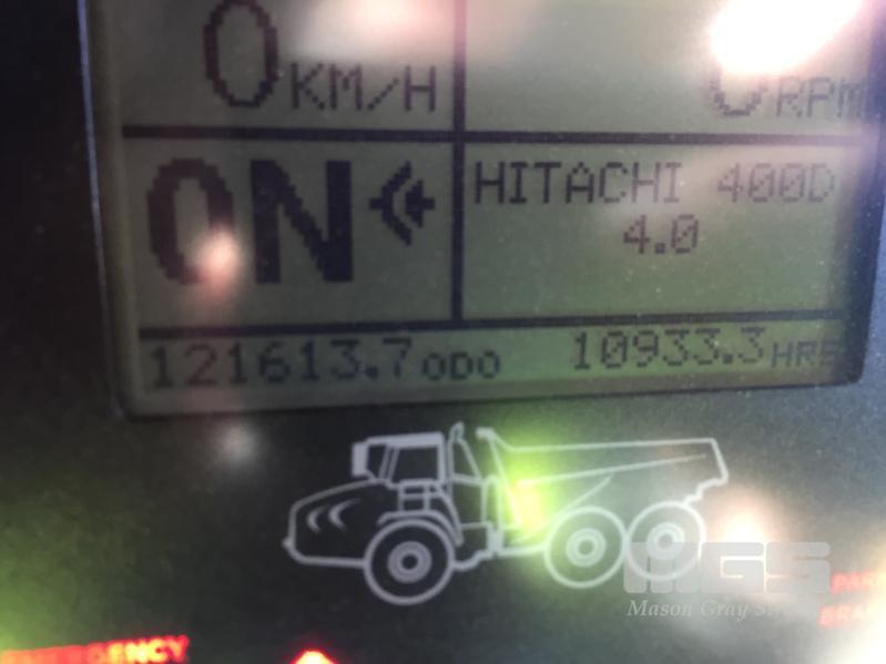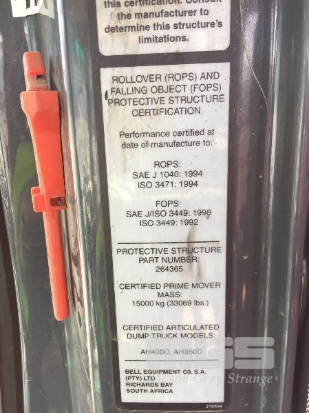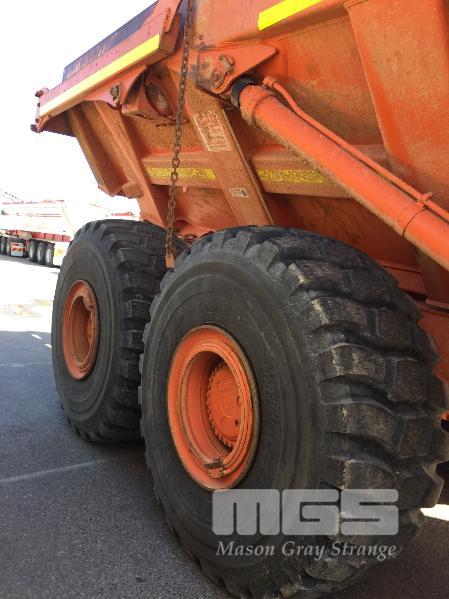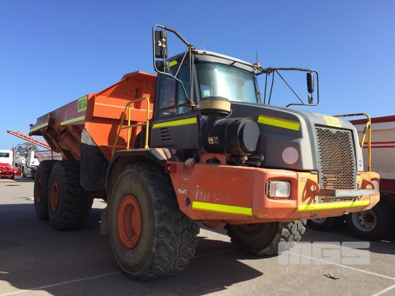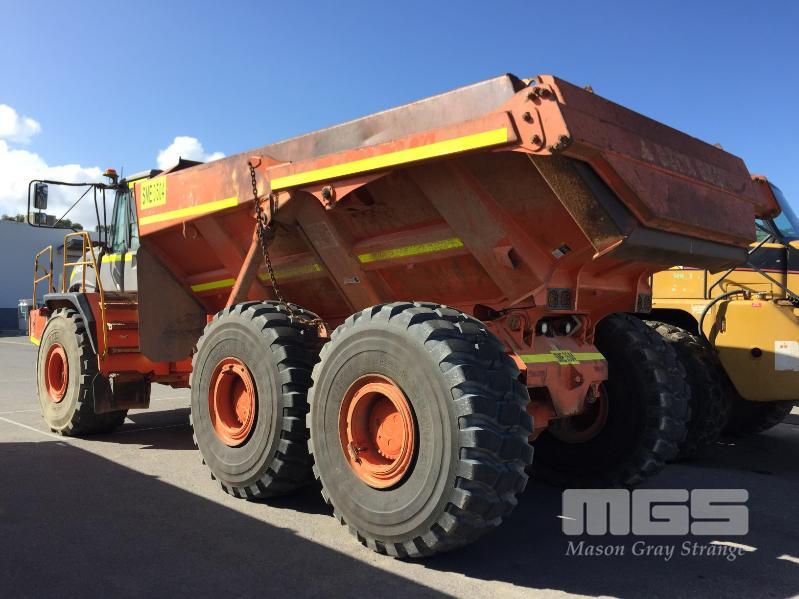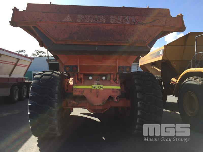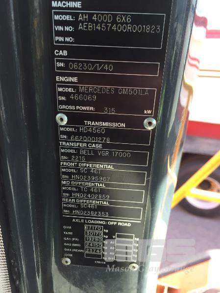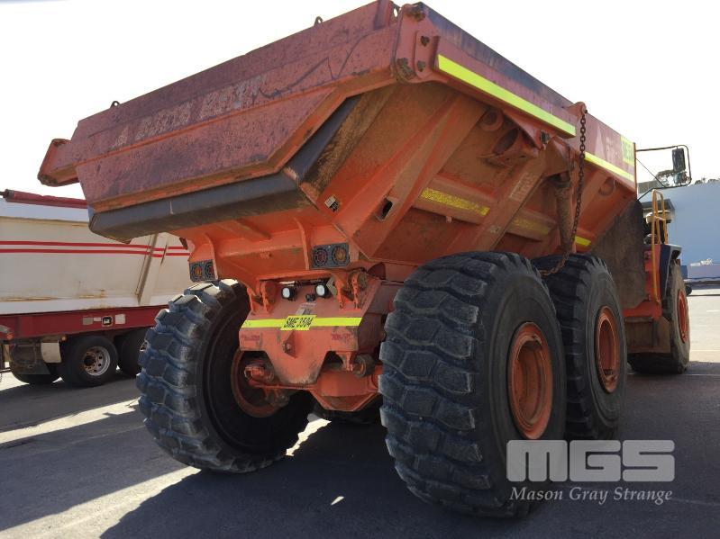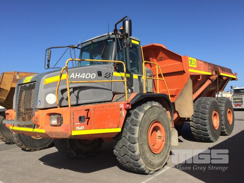 HITACHI AH400-D 6x6 ARTICULATED DUMP TRUCK VIN: AEB1457400R001823 ENG: 466069 ODO: 121,613kms SHOWING PLANT NO: SME3504 HOURS: 10,933hours GVM: 67,170kg TARE: 30,170kg MERCEDES OMS01LA, 315kw, HD4560 6 SPEED AUTOMATIC TRANSMISSION, DIESEL, ORANGE DUCO, 29.5R25 1 DOORS, 2 SEAT, AIR CON, CB RADIO, STEEL RIMS, FOPS BATTERY ISOLATION & EMERGENCY SHUTDOWN SWITCHES MONGOOSE CAMERA SYSTEM AUTO GREASING SYSTEM S/NO: 06230/1/40 (LOCATED REGENCY ROAD, FERRYDEN PARK SA) (NO PAPERS, WITH 1 KEY/S, NO OWNER'S MANUAL, NO SERVICE BOOKS)