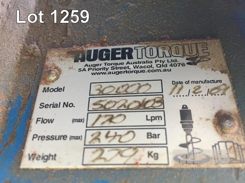AUGER ATTACHMENT, AUGER TORQUE MOD: 30000 170 LITRE/MIN FLOW 100mm PIN QUICK HITCH 110mm DRIVE 3 x EXTENSIONS, 2 x 320cm & 1 x 230cm 2 x AUGERS, 600 & 750mm (LOCATED REGENCY ROAD, FERRYDEN PARK SA)
