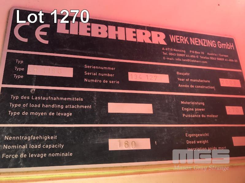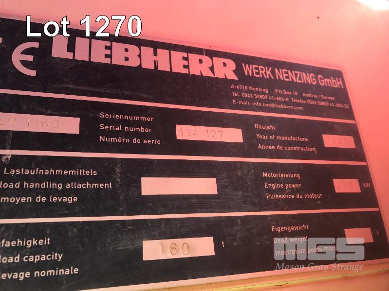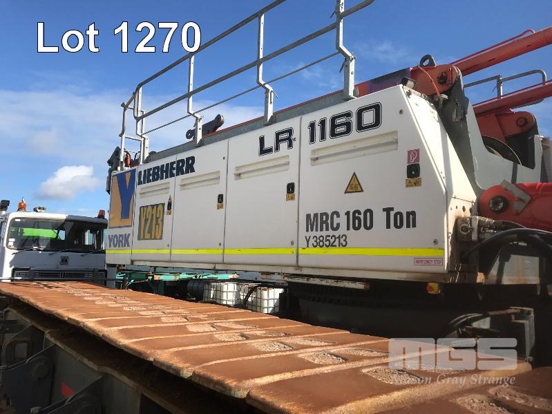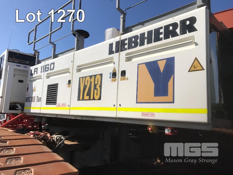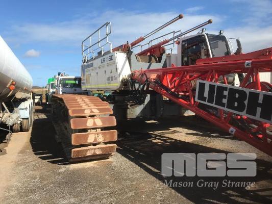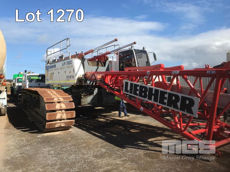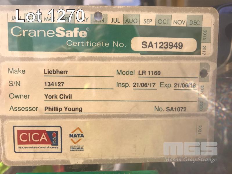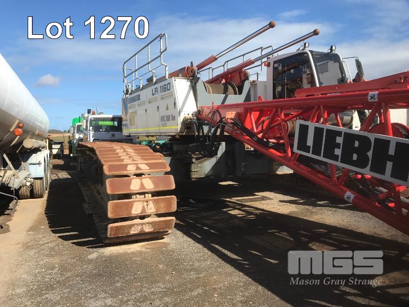 2008 LIEBHERR LR1160 CRAWLER CRANE REG: SB 77 DH (SA) PLANT NO: Y385213 HOURS: 4,620 GVM: 160,000 LEIBHERR, D936LA6, 6 CYLINDER, DIESEL, WHITE, 1 DOORS, 1 SEAT, PROJECT NO: 991864514 ENGINE NO: 2007047562 ENGINE POWER: 270KW REGLER ID: 10116985 MOTOR ID: 10116962 NOMINAL LOAD CAPACITY: 160 TONNE TRACKED, AIR CONDITIONER, CB RADIO, FIRE SUPPRESSION SYSTEM, BATTERY ISOLATION SWITCHES MOTEC LCD CAMERA SYSTEM, FLY, BOOM HEAD/END SECTION x 8m 160 TONNE 7 x SHEAVE HOOK, 100 TONNE 5 x SHEAVE HOOK, 40 TONNE SINGLE SHEAVE HOOK COUNTERWEIGHTS: 16 TONNE, 14.5 TONNE, 6 x 5.1 TONNE & 10 TONNE CARBODY WEIGHT 5 x BOOM SECTIONS @ 11.5m, 2 x BOOM SECTIONS @ 3m & 2 x BOOM SECTIONS @ 6m (LOCATED PORT WAKEFIELD ROAD, WATERLOO CORNER SA) (WITH PAPERS, WITH OWNER'S MANUAL, WITH SERVICE BOOKS)