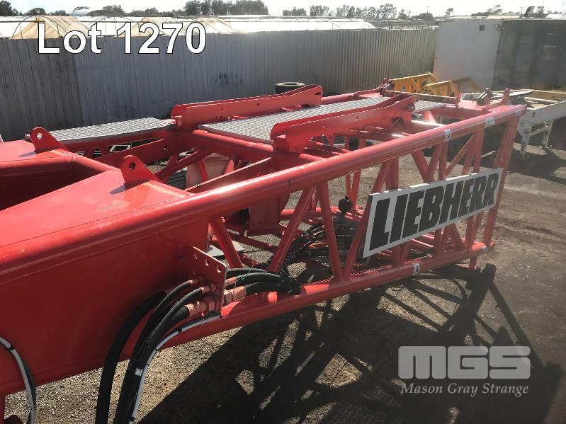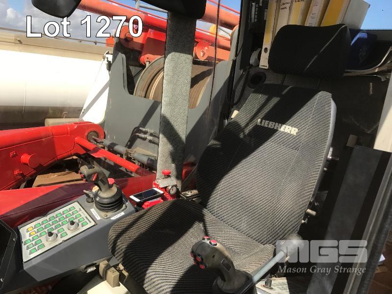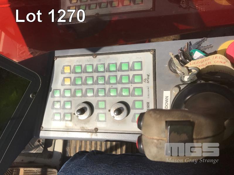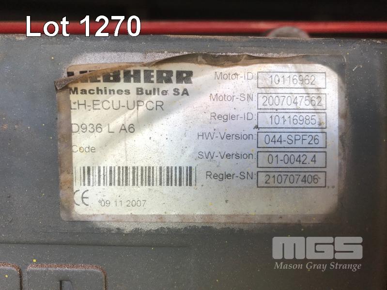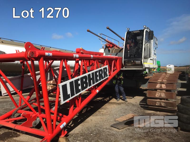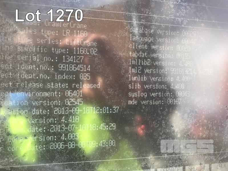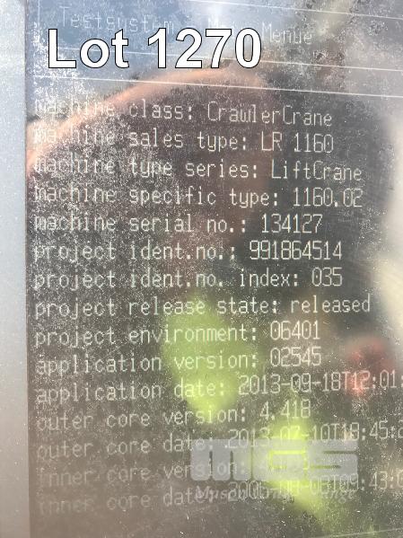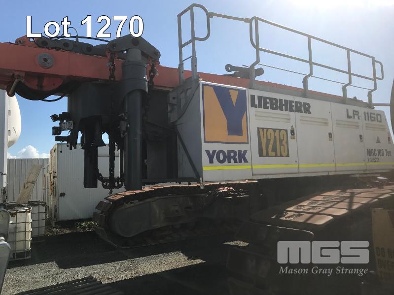 2008 LIEBHERR LR1160 CRAWLER CRANE REG: SB 77 DH (SA) PLANT NO: Y385213 HOURS: 4,620 GVM: 160,000 LEIBHERR, D936LA6, 6 CYLINDER, DIESEL, WHITE, 1 DOORS, 1 SEAT, PROJECT NO: 991864514 ENGINE NO: 2007047562 ENGINE POWER: 270KW REGLER ID: 10116985 MOTOR ID: 10116962 NOMINAL LOAD CAPACITY: 160 TONNE TRACKED, AIR CONDITIONER, CB RADIO, FIRE SUPPRESSION SYSTEM, BATTERY ISOLATION SWITCHES MOTEC LCD CAMERA SYSTEM, FLY, BOOM HEAD/END SECTION x 8m 160 TONNE 7 x SHEAVE HOOK, 100 TONNE 5 x SHEAVE HOOK, 40 TONNE SINGLE SHEAVE HOOK COUNTERWEIGHTS: 16 TONNE, 14.5 TONNE, 6 x 5.1 TONNE & 10 TONNE CARBODY WEIGHT 5 x BOOM SECTIONS @ 11.5m, 2 x BOOM SECTIONS @ 3m & 2 x BOOM SECTIONS @ 6m (LOCATED PORT WAKEFIELD ROAD, WATERLOO CORNER SA) (WITH PAPERS, WITH OWNER'S MANUAL, WITH SERVICE BOOKS)
