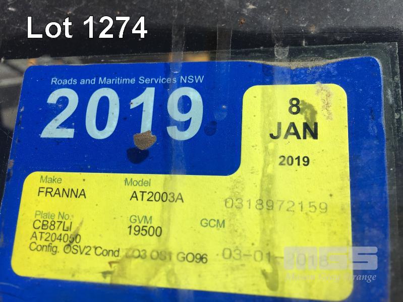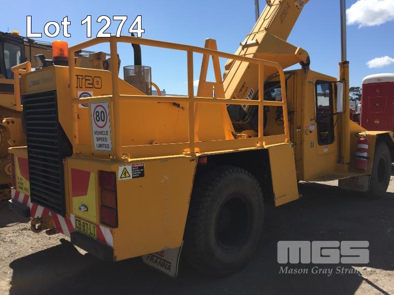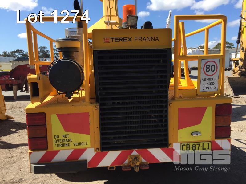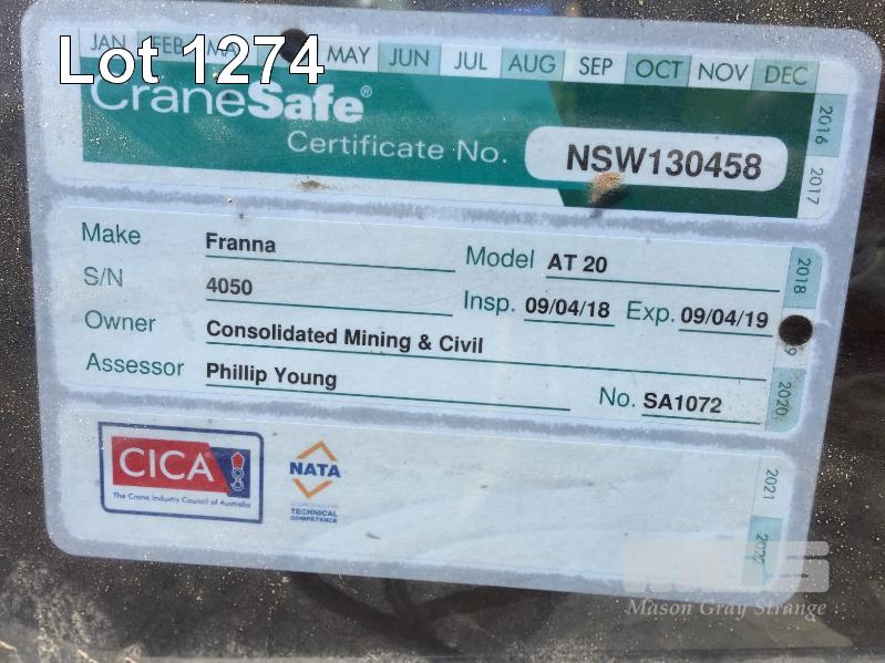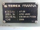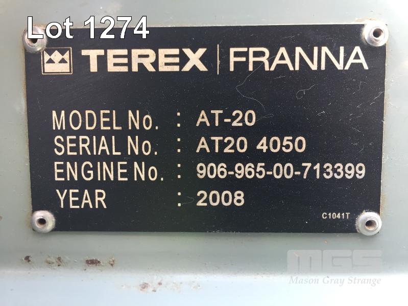 2008 FRANNA TEREX AT20 4x4 ARTICULATED MOBILE CRANE REG: CB 87 LI ENG: 90896500713399 HOURS: N/A GVM: 19,500kg MERCEDES, 6 CYLINDER TURBO DIESEL, AUTOMATIC TRANSMISSION, 12.00-20 2 DOORS, 2 SEAT, S/NO: AT204050 3BG DIGITAL BOOM CONTROL, CAMERA EMERGENCY STOP, ISOLATOR, EXTINGUISHER YEARLY INSPECTION DONE: 9/6/18 JIB EXTENSION, SPREADER BAR RING FEEDER, FRONT HOOK (LOCATED REGENCY ROAD, FERRYDEN PARK SA) (NO PAPERS, NO OWNER'S MANUAL, NO SERVICE BOOKS)