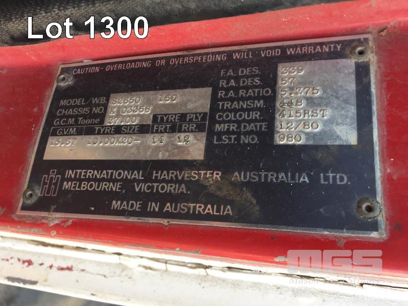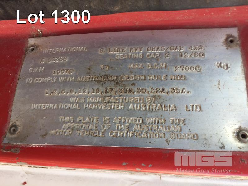 1980 INTERNATIONAL 2 S LINE HEAVY 4x6 REG: BQ 85 CF (NSW) VIN: K03366 ODO: 63,558kms SHOWING GVM: 15,670kg GCM: 27,000kg ROAD RANGER RT610 10 SPEED MANUAL TRANSMISSION, SPRING SUSPENSION, 295/80R22.5 2 DOORS, 2 SEAT, STEEL REAR RIMS, FRONT SPIDER RIMS, EMERGENCY STOP 6.7m STEEL TRAY (LOCATED REGENCY ROAD, FERRYDEN PARK SA) (NO PAPERS, NO OWNER'S MANUAL, NO SERVICE BOOKS)