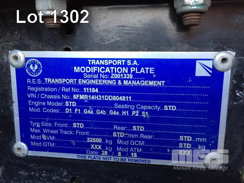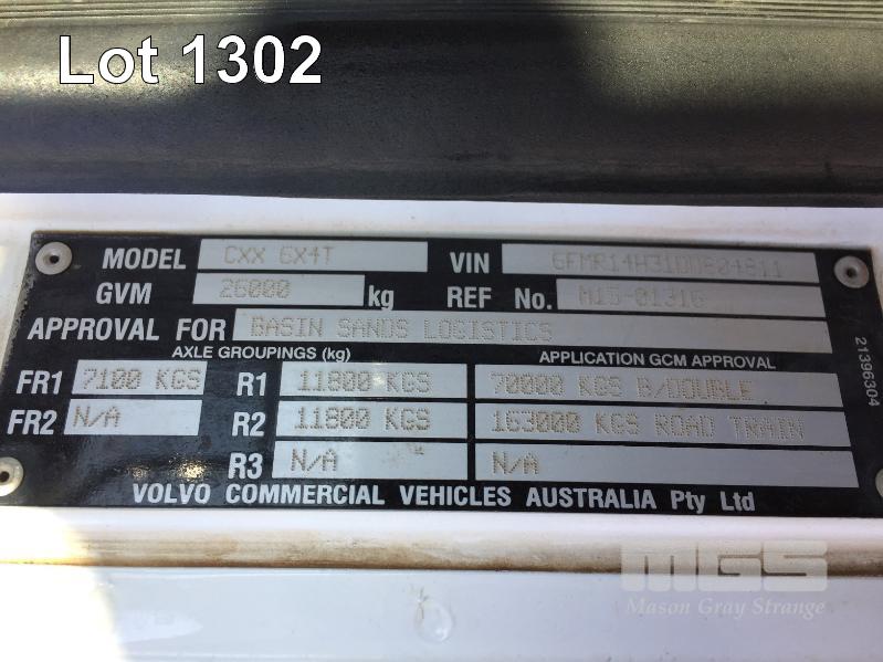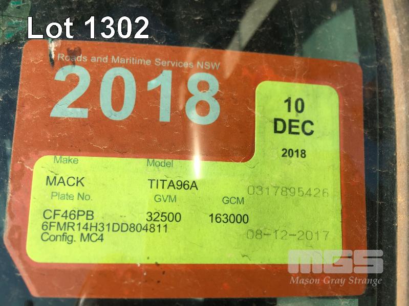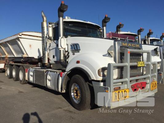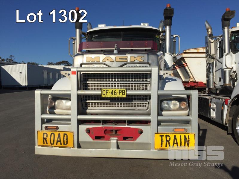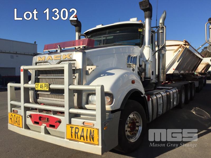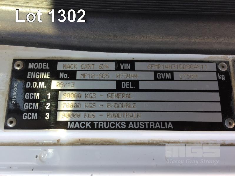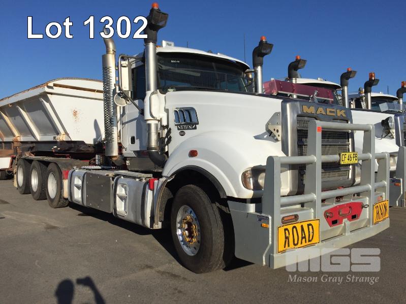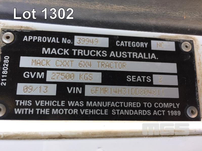 2013 MACK CXXT TITAN 8x4 PRIME MOVER LONG NOSE REG: CF 46 PB (NSW) VIN: 6FMR14H31DD804811 ENG: MP10-685073444 ODO: 821,325kms SHOWING HOURS: 13,229hours GVM: 32,500kg GCM: 163,000kg MACK, MP10 685HP, MACK M DRIVE SPEED AUTOMATIC TRANSMISSION, DIESEL, AIRBAG SUSPENSION, WHITE DUCO, 11R22.5 2 DOORS, 2 SEAT, AIR CON, ALLOY RIMS, B TRIPLE RATED, CD PLAYER, CB RADIO, BULL BAR, HYDRAULICS, ROCK SCREEN, TIPPER HOIST CONTROLS, VISOR, 3 x FUEL TANKS, 2 x AD BLUE/(DEF) TANK AUTO GREASE SYSTEM AXLE LIFT SYSTEM (LOCATED REGENCY ROAD, FERRYDEN PARK SA) (NO PAPERS, WITH 1 KEY/S, NO OWNER'S MANUAL, NO SERVICE BOOKS)