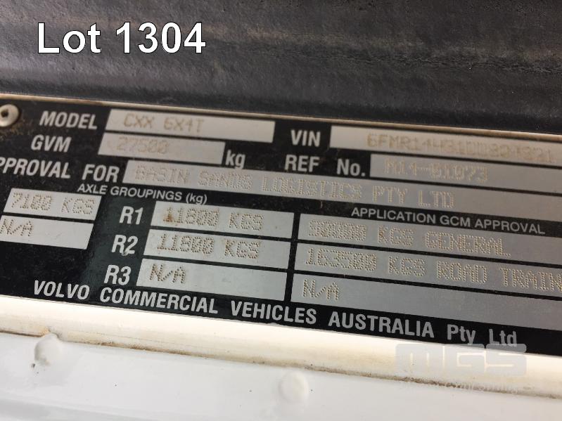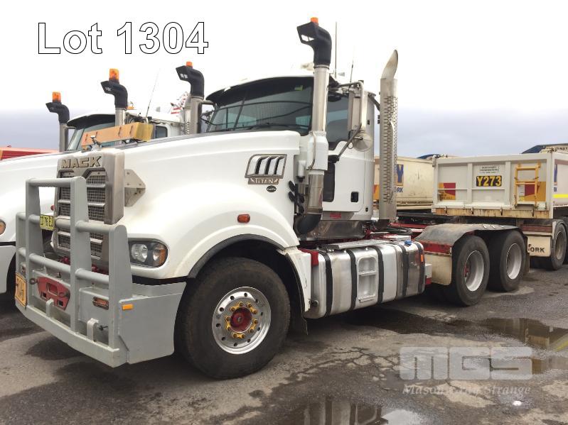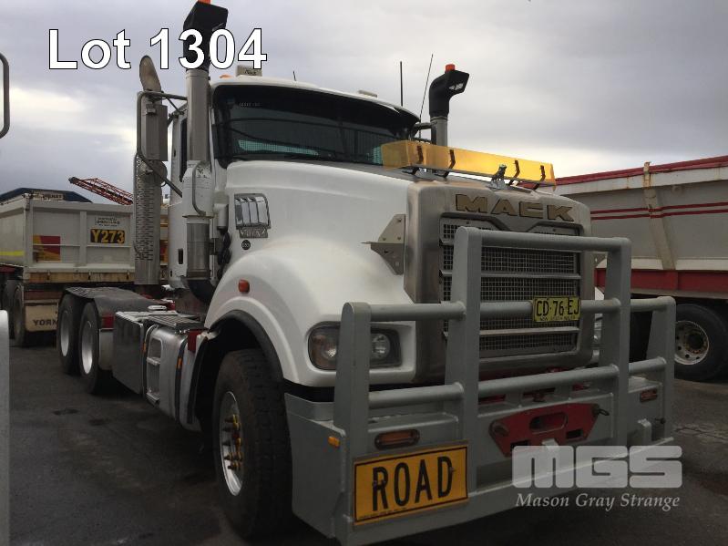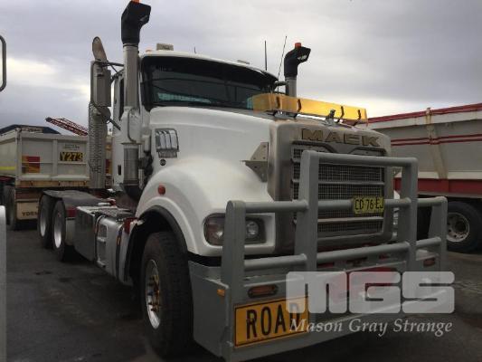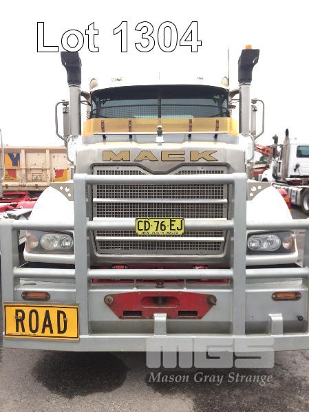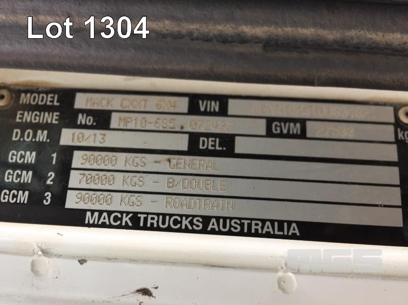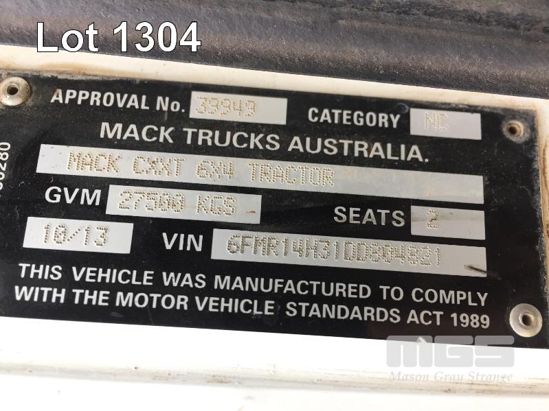 2013 MACK CXXT TITAN 6x4 PRIME MOVER LONG NOSE REG: CD 76 EJ VIN: 6FMR14H31DD804821 ENG: MP10-685072422 ODO: 985,552kms SHOWING HOURS: 16,351hours GVM: 27,500kg GCM: 163,500kg MACK MP10, 685HP, MACK M DRIVE SPEED AUTOMATIC TRANSMISSION, DIESEL, AIRBAG SUSPENSION, WHITE DUCO, 11R22.5 2 DOORS, 2 SEAT, AIR CON, ALLOY RIMS, B DOUBLE RATED, CD PLAYER, CB RADIO, BULL BAR, HYDRAULICS, ROCK SCREEN, TIPPER HOIST CONTROLS, VISOR, 2 x FUEL TANKS & 1 x AD BLUE/DEF TANK AUTO GREASE SYSTEM (LOCATED REGENCY ROAD, FERRYDEN PARK SA) (NO PAPERS, WITH 1 KEY/S, NO OWNER'S MANUAL, NO SERVICE BOOKS)