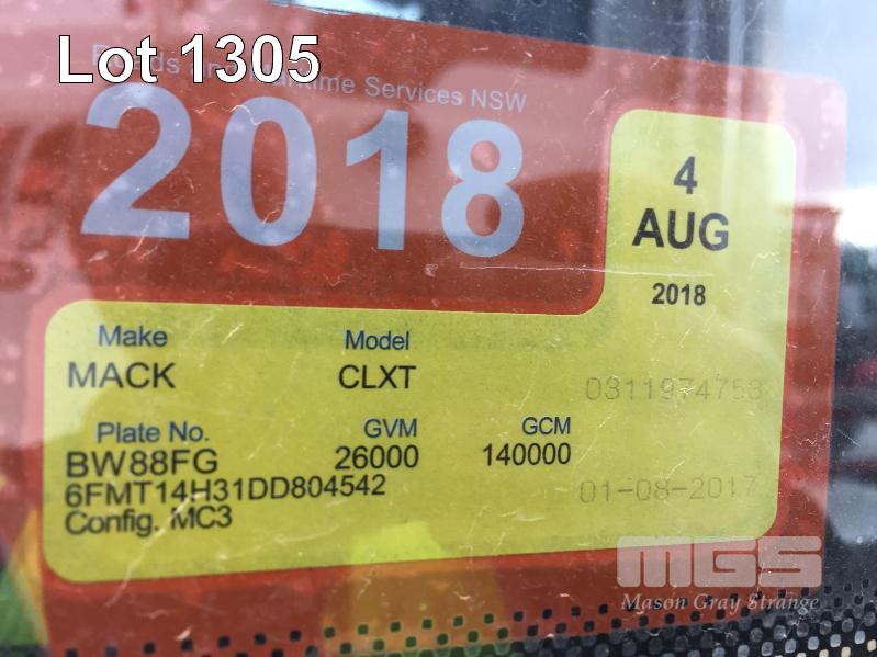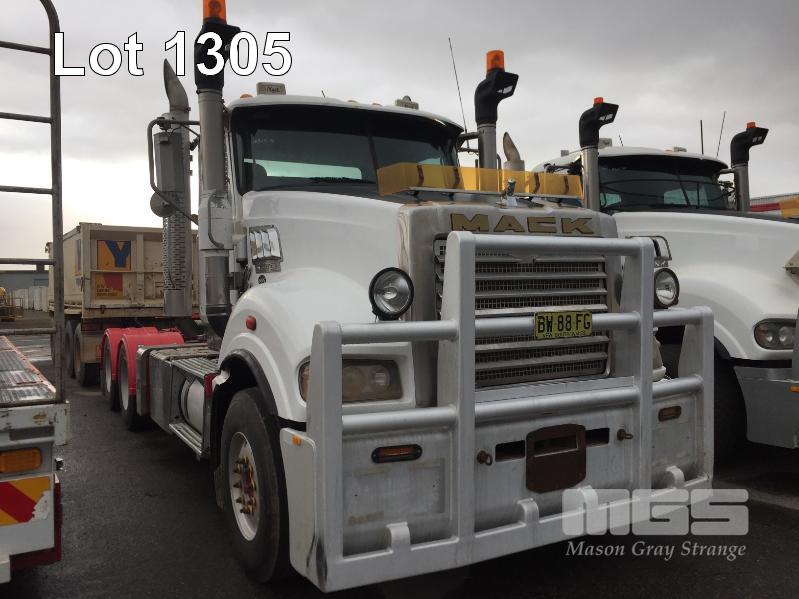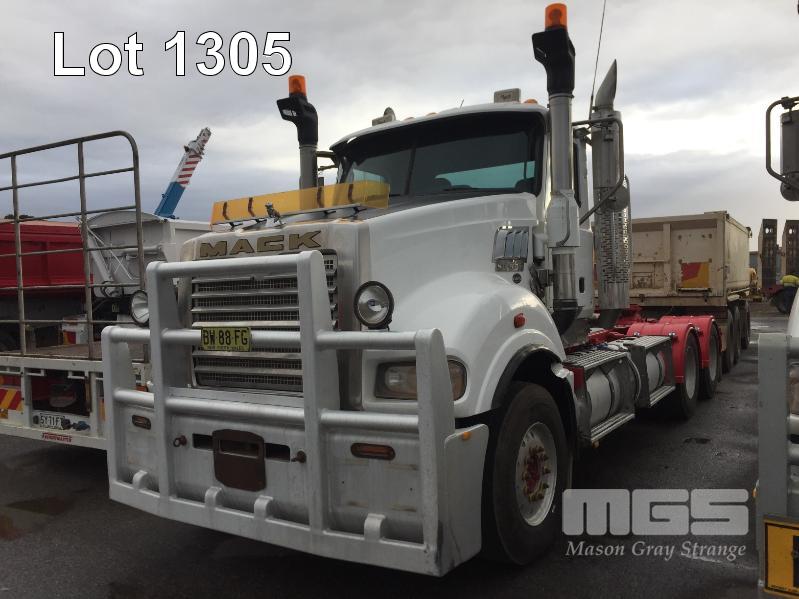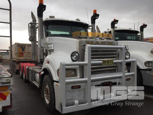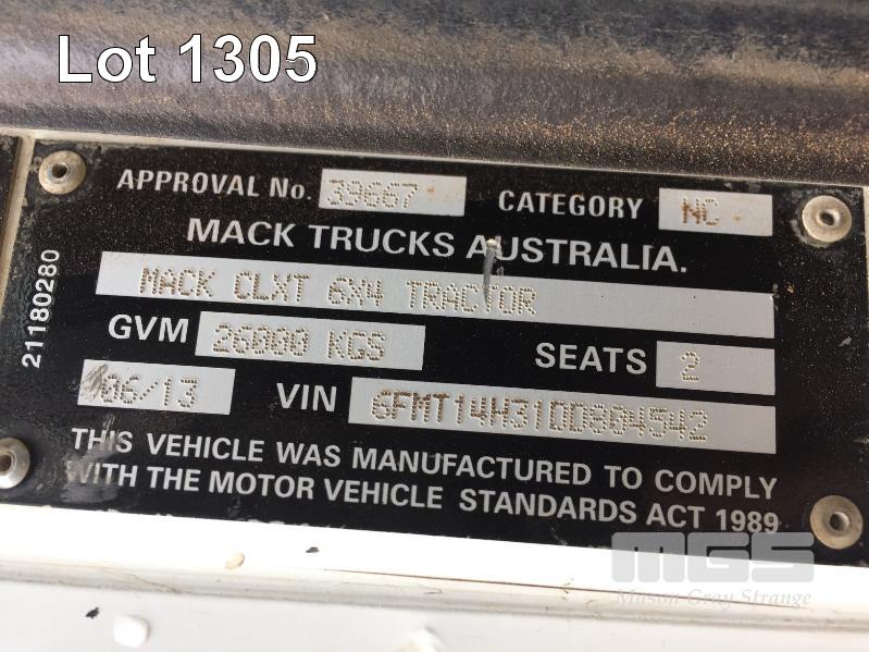 2013 MACK CLXT SUPER LINER 6x4 PRIME MOVER LONG NOSE REG: BW 88 FG (NSW) VIN: 6FMT14H31DD804542 ENG: MP10-600070163 ODO: 1,463,379 GVM: 26,000kg GCM: 140,000kg MACK MP10, 685HP, MACKM DRIVE SPEED AUTOMATIC TRANSMISSION, DIESEL, AIRBAG SUSPENSION, WHITE DUCO, 11R22.5 2 DOORS, 2 SEAT, AIR CON, ALLOY RIMS, B TRIPLE RATED, CD PLAYER, CB RADIO, BULL BAR, DRIVING LIGHTS, HYDRAULICS, TIPPER HOIST CONTROLS, 3 x FUEL TANKS & 1 x AD BLUE/DEF TANK AUTO GREASE SYSTEM (LOCATED REGENCY ROAD, FERRYDEN PARK SA) (NO PAPERS, WITH 1 KEY/S, NO OWNER'S MANUAL, NO SERVICE BOOKS)