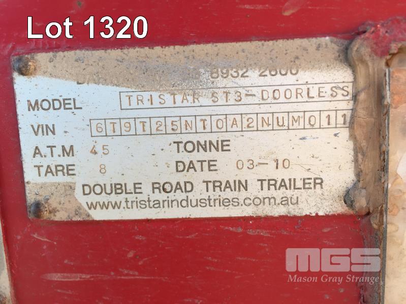 03 / 2010 TRISTAR IND ST3 DOORLESS TRIAXLE SIDE TIPPER SEMI TRAILER REG: WIO 064 (NSW) VIN / CHASSIS: 6T9T25NT0A2NUM011 ATM: 45T AIRBAG SUSPENSION, 11R22.5, TARE: 8T ALLOY RIMS, B DOUBLE RATED 9.4m STEEL BODY ROLL OVER TARP COVER (LOCATED REGENCY ROAD, FERRYDEN PARK SA) (NO PAPERS)
