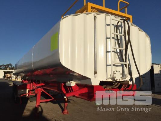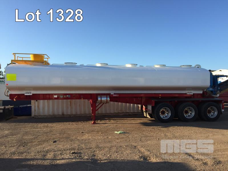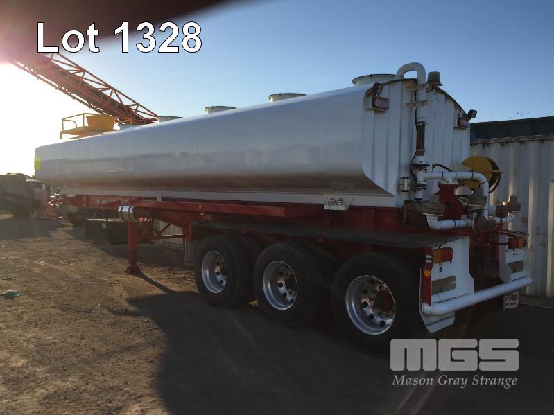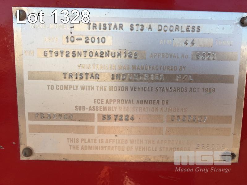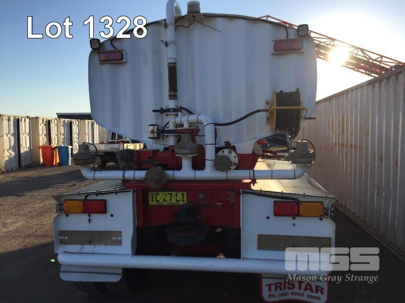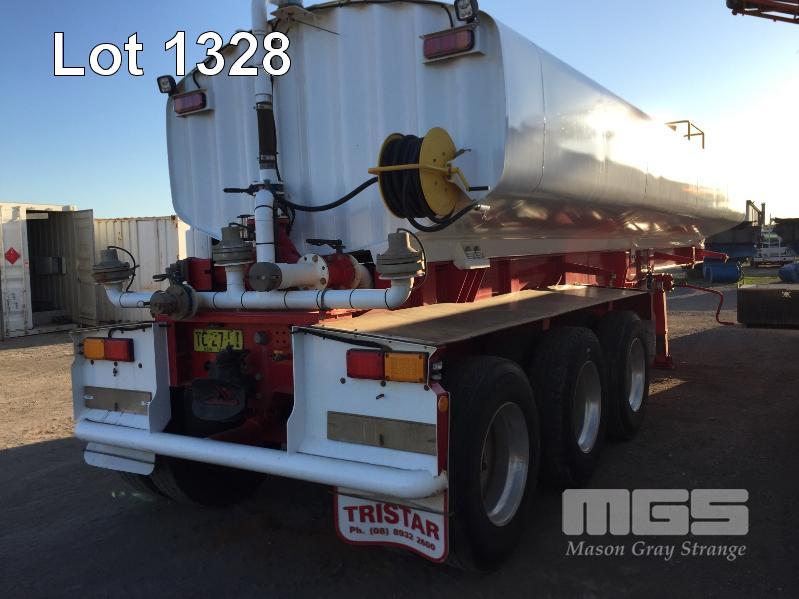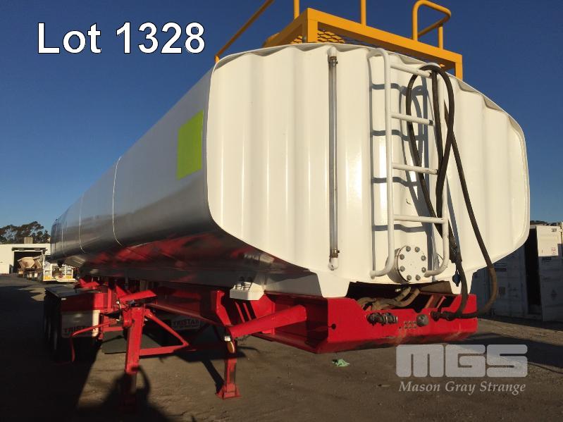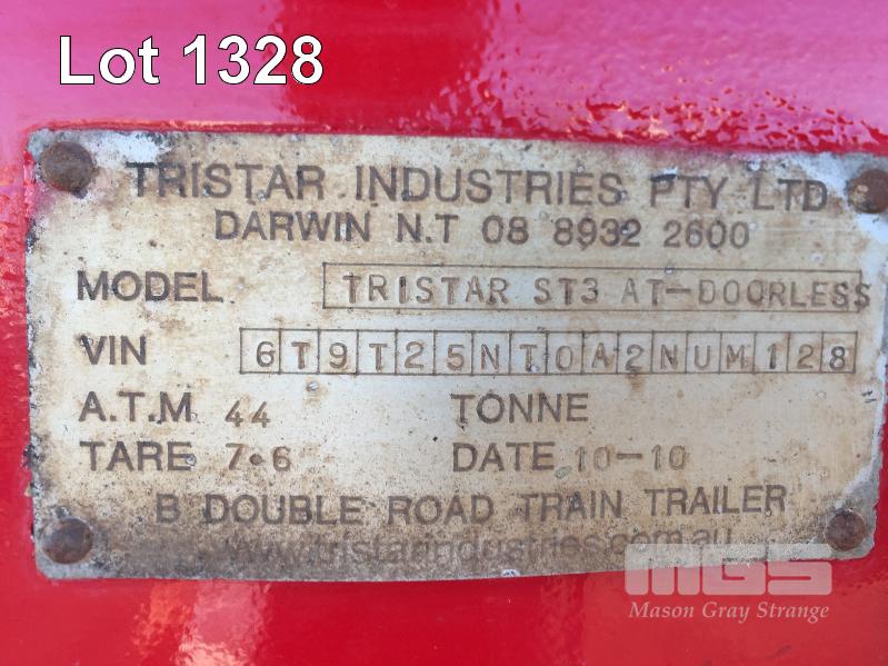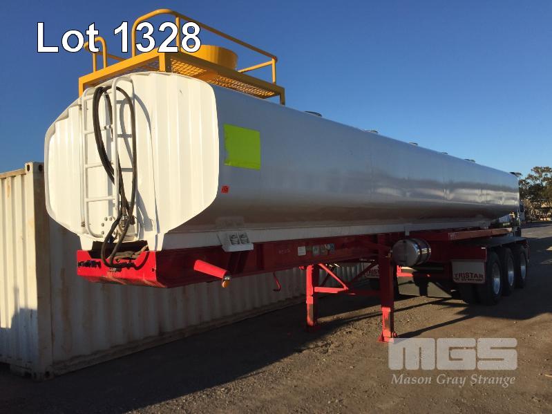 10 / 2010 TRISTAR IND TRIAXLE WATER TANK SEMI TRAILER MODEL: TRISTAR ST3 AT DOORLESS REG: TC 27 LI (NSW) VIN / CHASSIS: 6T9T25NT0A2NUM128 ATM: 44T AIRBAG SUSPENSION, 11R22.5, TARE: 7.6T ALLOY RIMS, B DOUBLE RATED ROAD TRAIN RATED, STEEL TANK HYDRAULIC DRIVEN PUMP, REAR MOUNT DRIBBLE & SPRAY BARS WATER TANK, SIDE MOUNT RETRACTABLE HOSE REEL REAR RING FEEDER HITCH (LOCATED REGENCY ROAD, FERRYDEN PARK SA) (NO PAPERS)