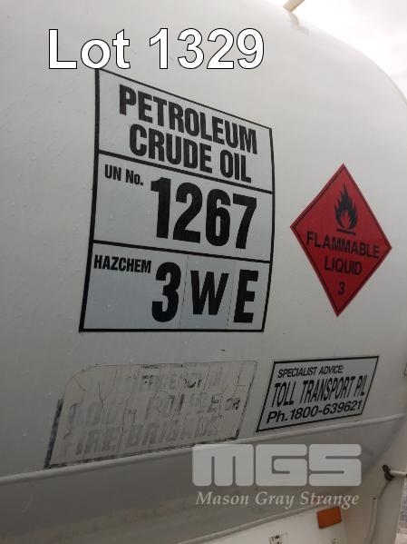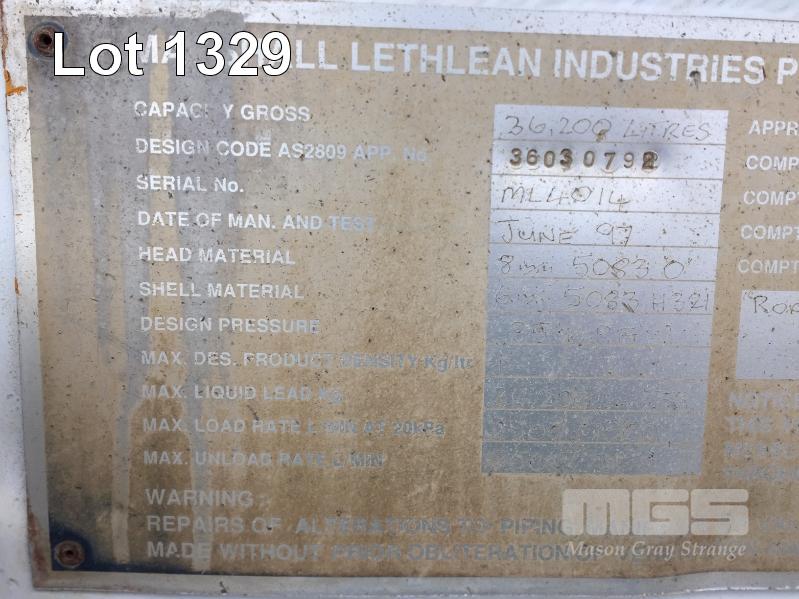 6 / 1997 MARSHALL LETHLEAN TRIAXLE FUEL TANKER SEMI TRAILER REG: SV 71 BW (SA) VIN / CHASSIS: 6D9T25RFAV2057023 ATM: 35,000 AIRBAG SUSPENSION, SPIDER RIMS, 11R22.5, ALLOY TANK TOTAL CAP: 36,200 LITRES 3 x COMPARTMENT, 2 x 8,700 LITRE & 1 x 17,400 LITRE REAR RING FEEDER HITCH UNDER TANK TOOL BOX ROAD TRAIN RATED (LOCATED REGENCY ROAD, FERRYDEN PARK SA) (NO PAPERS)