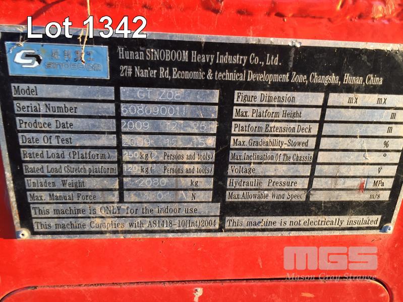 ELECTRIC SCISSOR LIFT, SINOBOOM MOD: GTJ708 DOM: 2009 MAX HEIGHT: 9m MAX WEIGHT: 250kg ALL FAULTS (LOCATED REGENCY ROAD, FERRYDEN PARK SA)